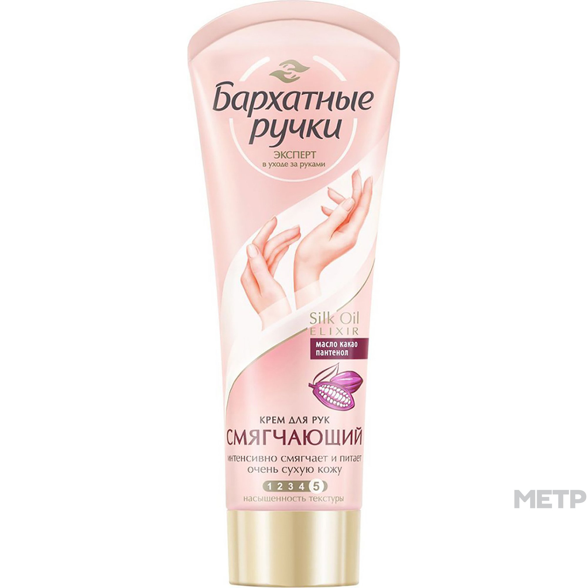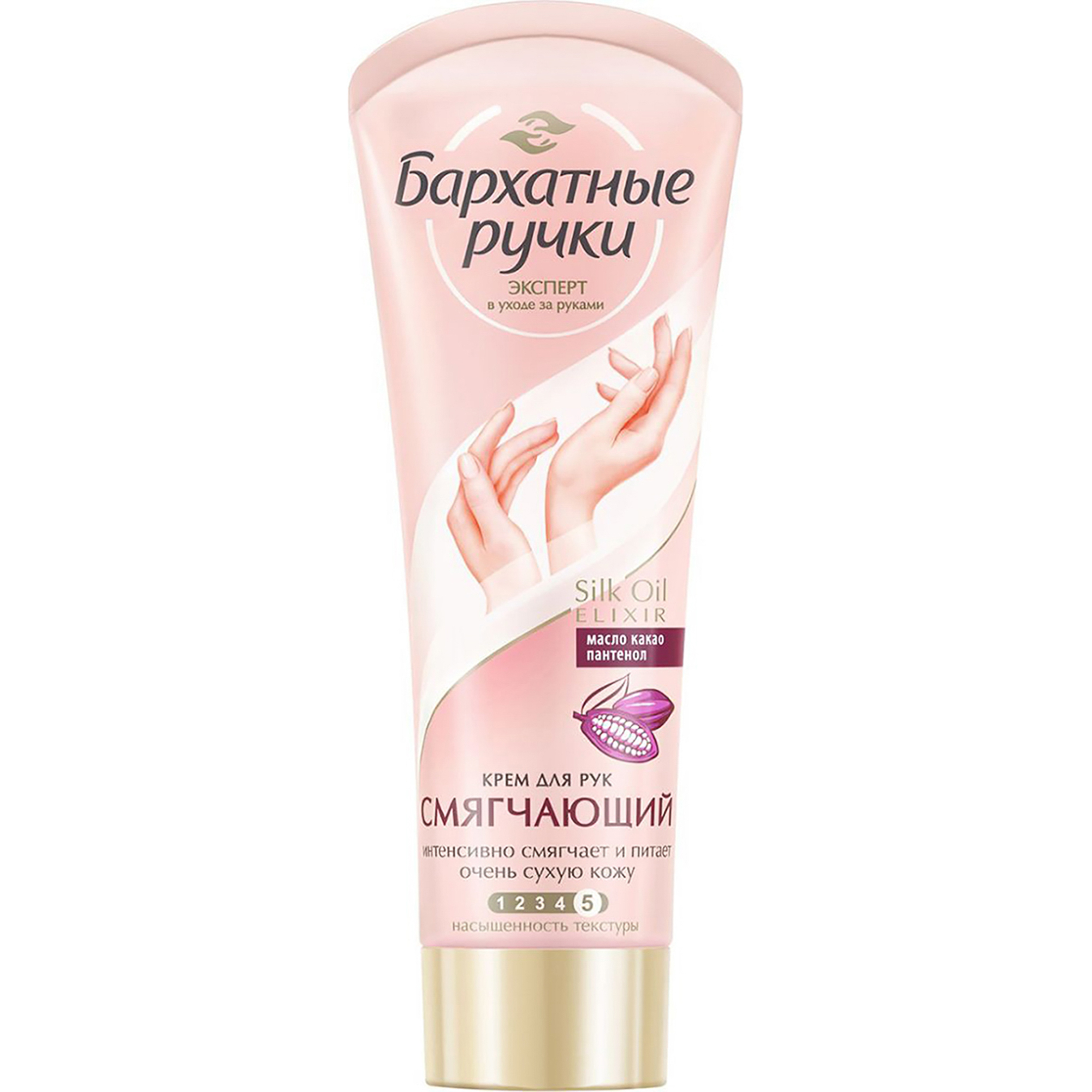 Крем для рук Бархатные ручки Смягчающий 80 мл обогащен формулой Silk Oil Elixir, которая обеспечивает глубокое проникновение активных компонентов в слои эпидермиса. Масло какао заживляет, смягчает, защищает от холода и ветра, эффективно заживляет ожоги и трещины. Кукурузное масло укрепляет естественный защитный барьер кожи, устраняет шелушения и сухость. Глицерин, мочевина и аллантоин увлажняют, смягчают и стимулируют обновление клеток кожи.