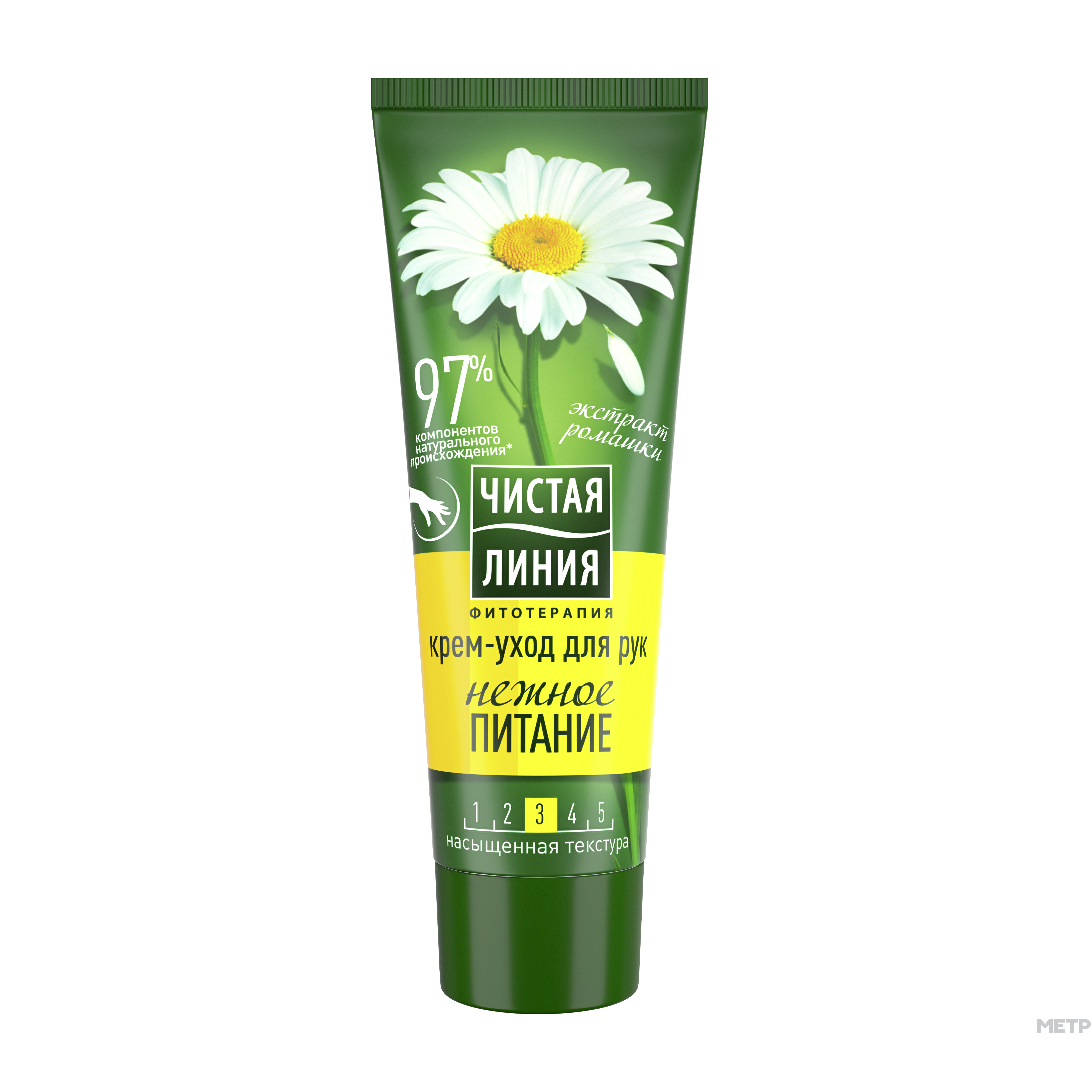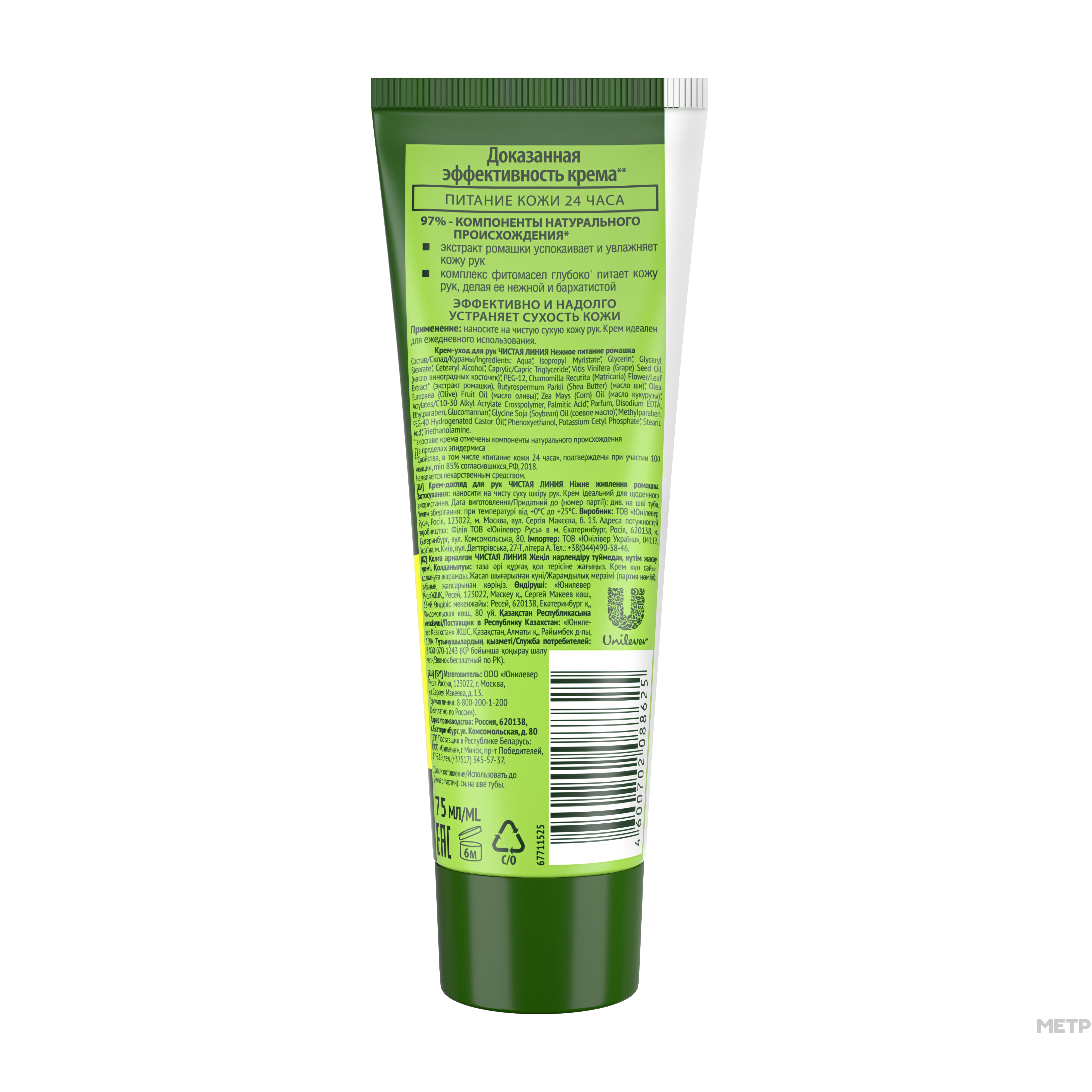 Крем для рук Чистая линия Нежное питание с ромашкой 75 мл содержит в составе Bio-коллаген, защищающий кожу от потери влаги, и экстракт ромашки, известный антибактериальным и антиоксидантным эффектом. Крем обеспечивает длительное увлажнение, смягчает огрубевшие участки кожи, восстанавливает и глубоко питает кожу, возвращая ей гладкость и молодость.