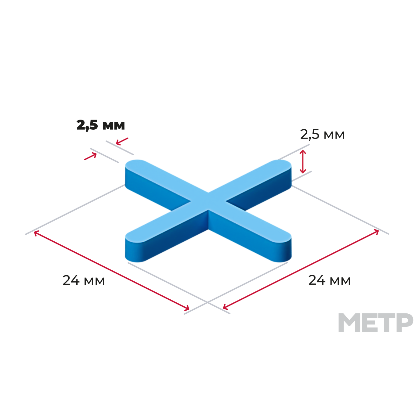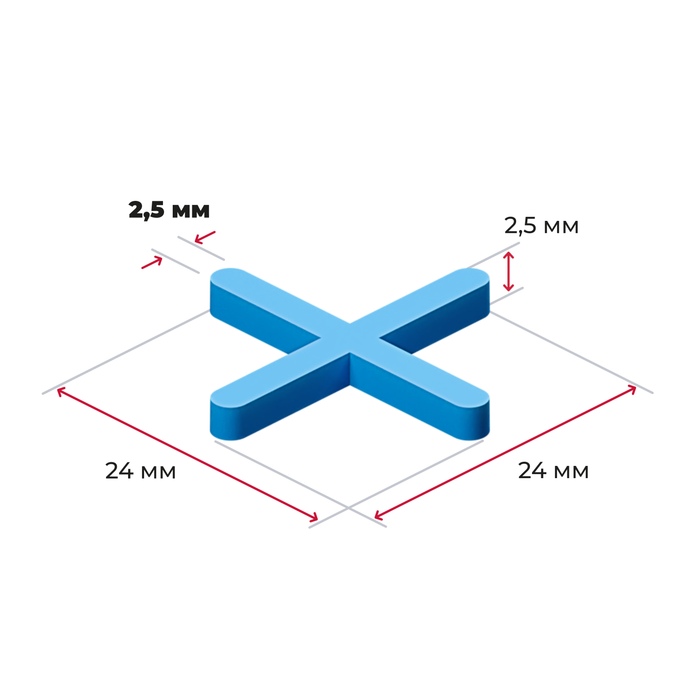 Голубые распорки в форме крестика предназначены для швов шириной в 2,5 мм. Подходят для плитки, керамогранита и мрамора. Используются для большинства видов швов.