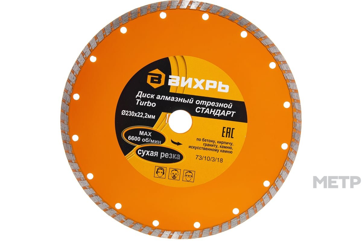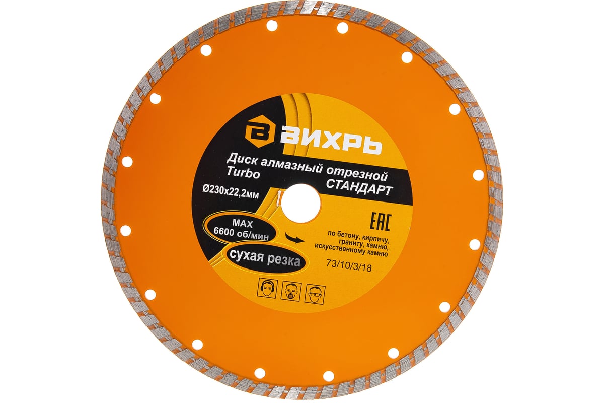 Круг отрезной 230х22,2мм алмазный Турбо СТАНДАРТ комбинированный сухой используется совместно с угловыми шлифмашинами (болгарками) для сухой резки гранитных, бетонных, кирпичных и каменных изделий.