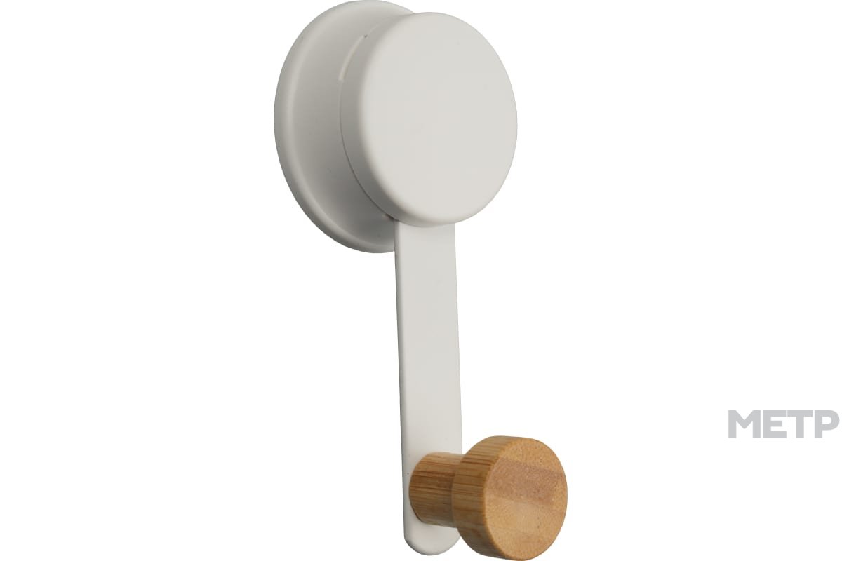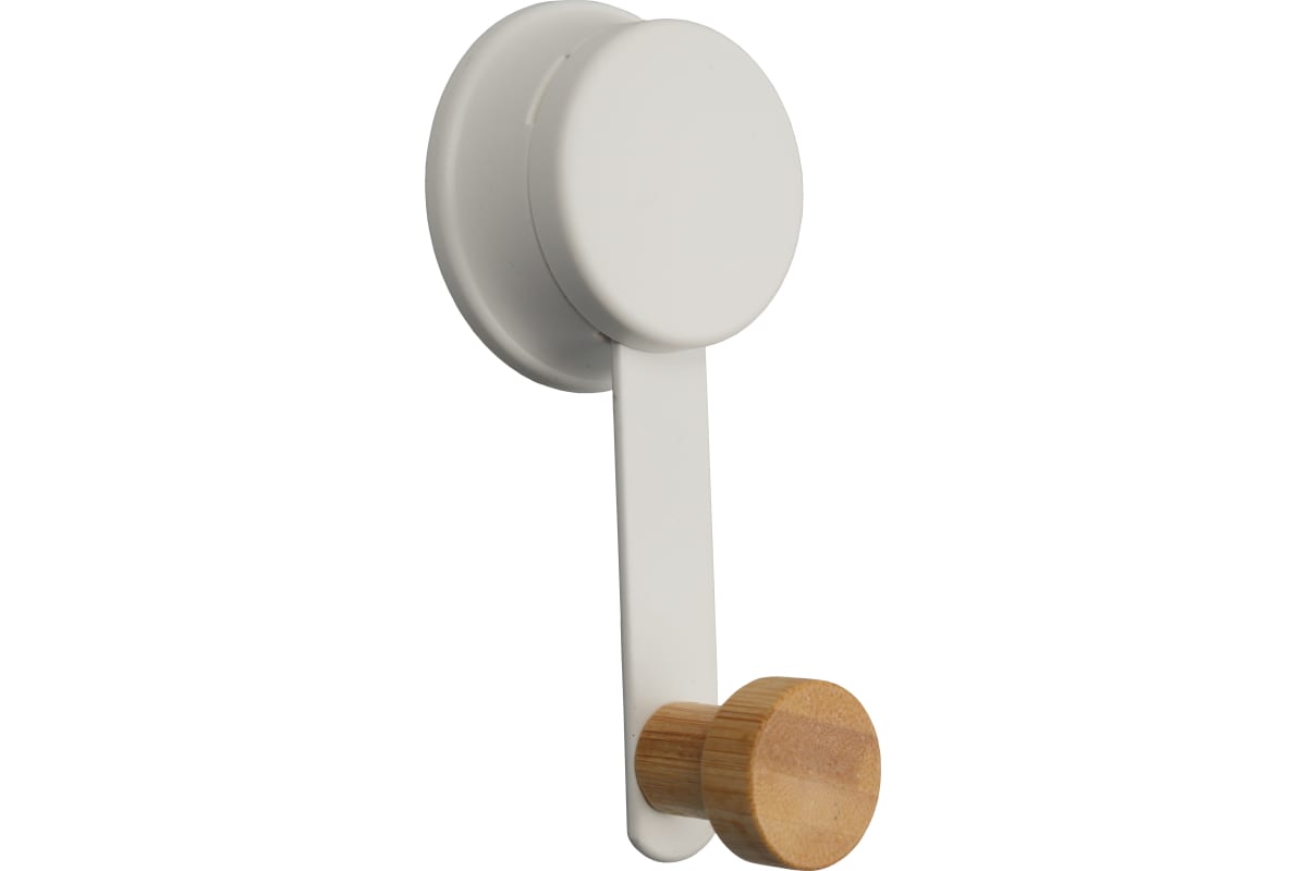 Одинарный крючок на присоске. Металлическая основа с порошковым напылением + бамбуковый крючок, прочная присоска из термопластичной резины и АВС-пластика. Максимальная нагрузка до 2 кг