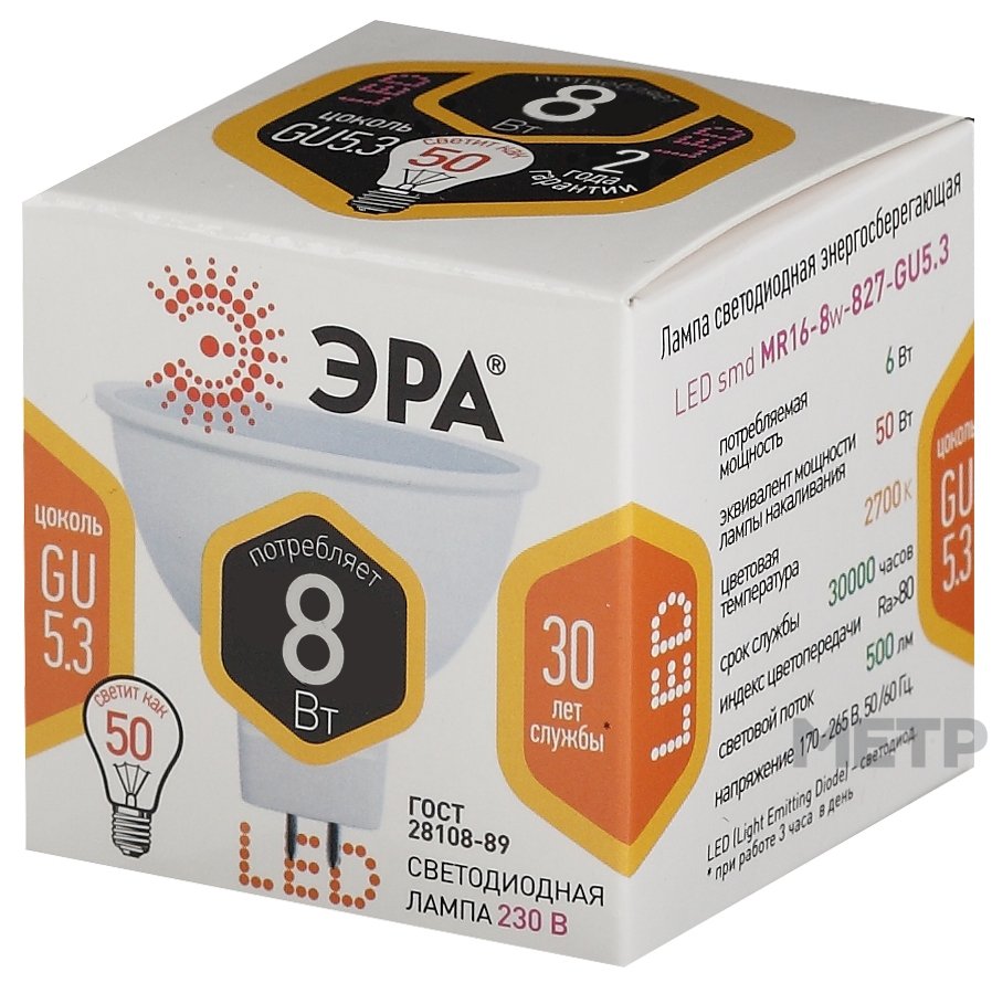 Лампа светодиодная ЭРА GU5.3 8 Вт 2700 К теплый белый свет представляет альтернативу 50-ваттной лампе накаливания. Корпус с матовым рассеивателем выполнен по стандарту MR16 и имеет размеры 50х50 мм. Лампа рассчитана на напряжение 230 В и установку на объектах с температурой от -25 до +50 градусов. Гарантия 2 года. Страна производителя Китай.