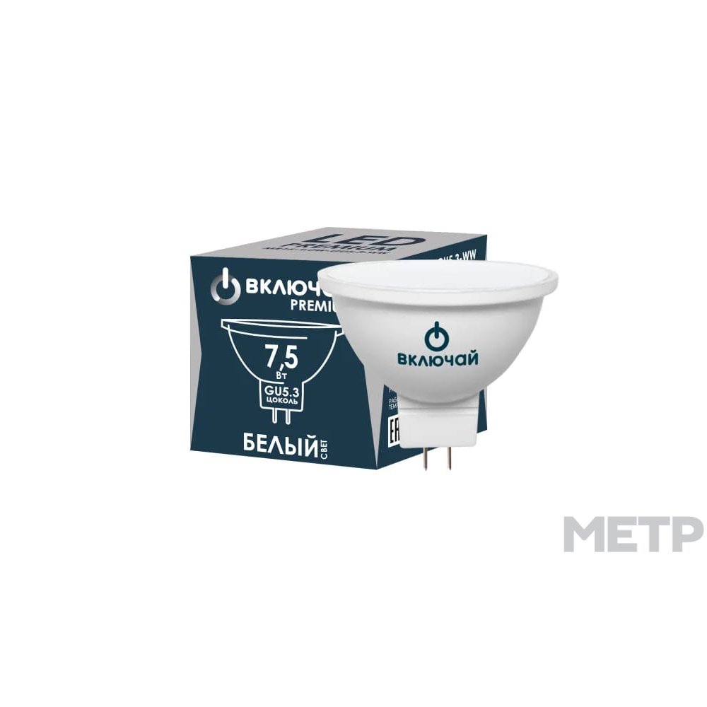Лампа светодиодная Включай PREMIUM GU5.3 7,5 Вт 4000 К нейтральный белый свет является альтернативой лампе накаливания мощностью 50 Вт. Имеет размеры 50х50 мм и корпус MR16 с матовым рассеивателем. Предназначено для эксплуатации в сетях напряжением 220 В при температуре от -20 до +40 градусов. Расчётный срок службы 30 000 часов, предоставляется гарантия 2 года. Страна изготовителя Китай.