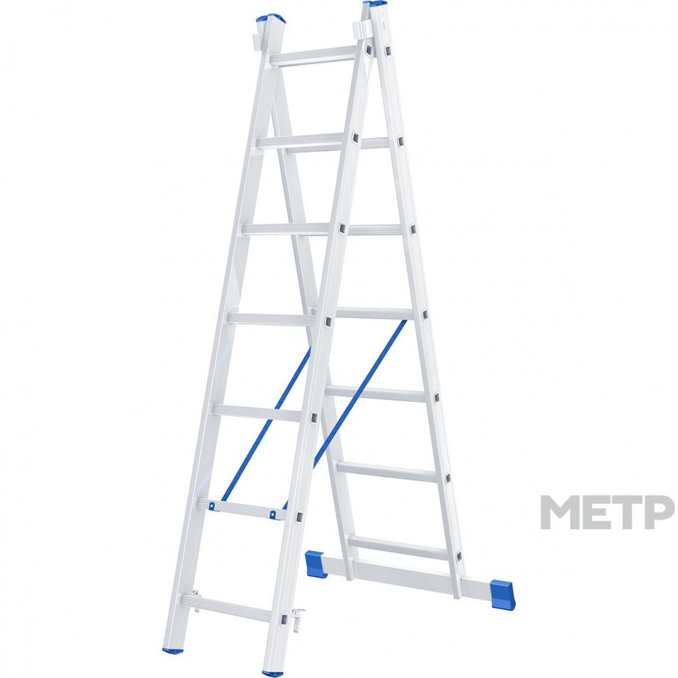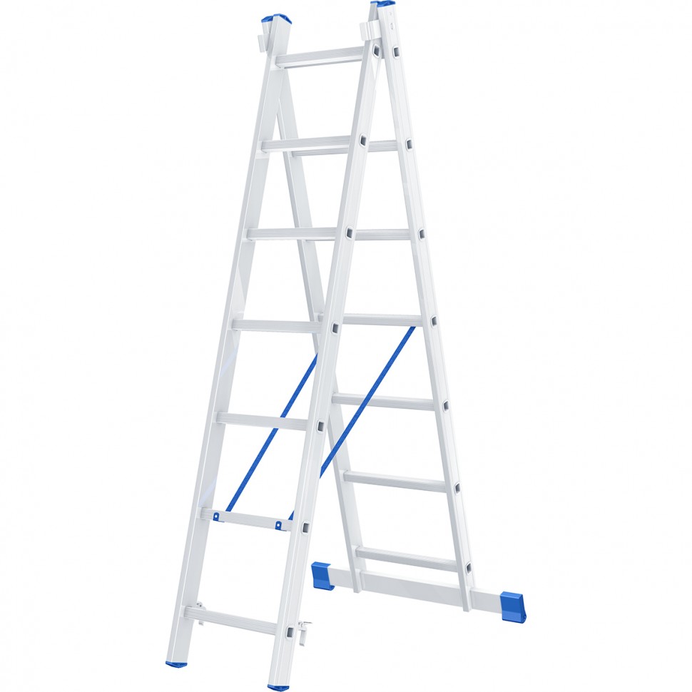 Лестница Сибртех 7 ступеней алюминий имеет 2 секции, скрепленные между собой прочными алюминиевыми рамами. Обеспечивает 3 рабочих положения: приставная лестница, обычная стремянка и двухсторонняя стремянка. Выдерживает максимальную нагрузку в 150 кг. Надежно фиксируется на поверхностях любого типа.