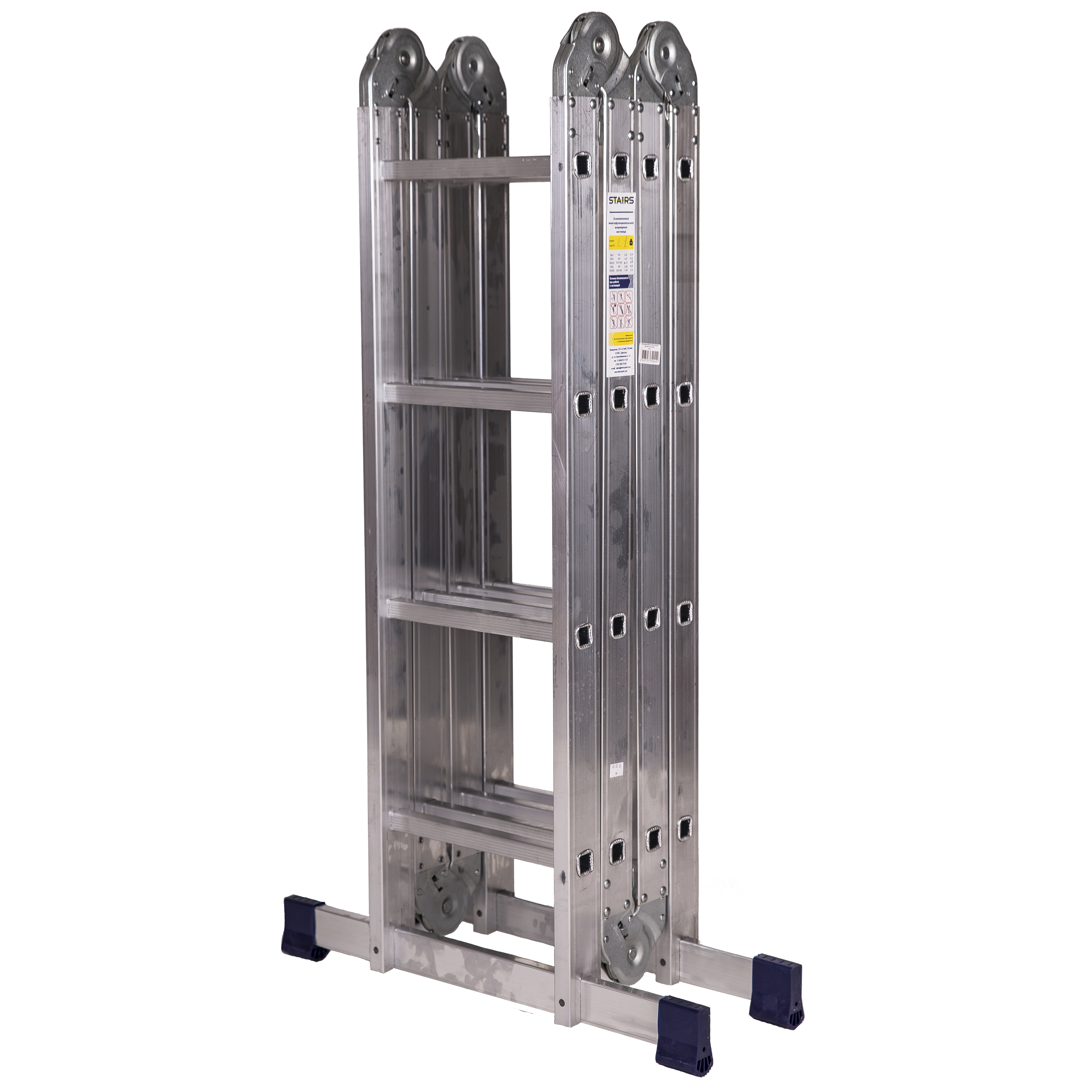 Лестница-трансформер STAIRS 4х4 ступени алюминиевая универсальная и заменяет несколько разных изделий. Лестница легко превращается в двухстороннюю стремянку, приставную лестницу или лестницу с консолью. В положении помост запрещено использование без твёрдого, жёсткого настила на рабочей площадке.Алюминиевый сплав делает лестницу легкой, но при этом прочной за счет увеличенной изностойкости материала. Алюминий не подвержен коррозии, что позволяет использовать лестницу как в помещении, так и на открытом пространстве.
