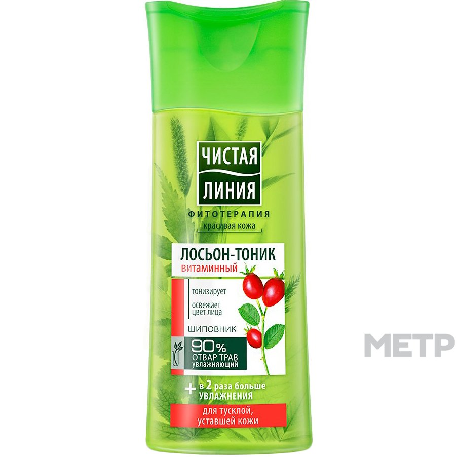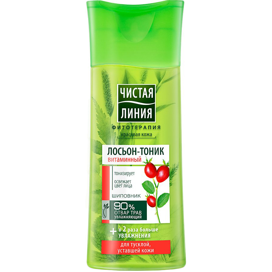 Лосьон-тоник для лица Чистая линия Витаминный 100 мл универсален для всех типов кожи. Способствует увлажнению и смягчению. Борется с сухостью, замедляет процесс старения благодаря своевременному обновлению. Предотвращает стянутость, которая может возникнуть в процессе умывания.