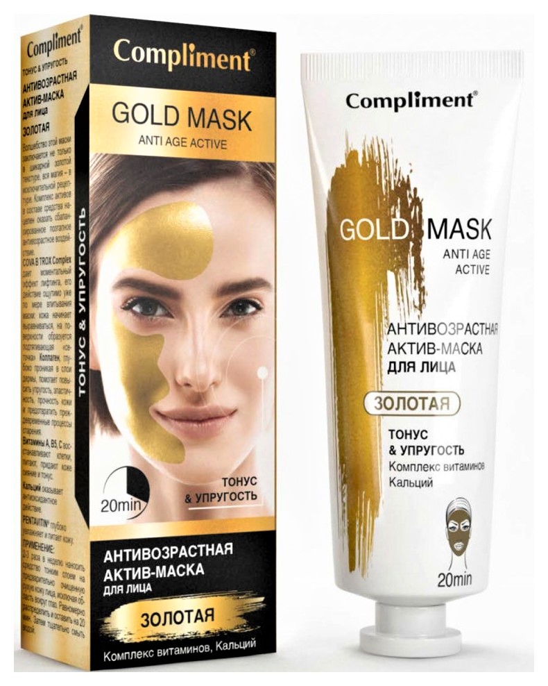 Маска для лица Compliment антивозрастная Gold Mask Тонус и упругость 80 мл придаст коже тонус и сияние, предотвратит появление морщин, поможет восстановить тон кожи, повысить ее упругость. Имеется лифтинг-эффект, оказывает антивозрастное воздействие. Можно использовать 2-3 раза в неделю.