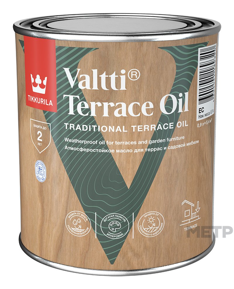 Органоразбавляемое масло, содержащее воск, для защиты и отделки деревянных поверхностей снаружи помещений. В состав Tikkurila Valtti Terrace Oil входит натуральное масло, которое глубоко проникает в структуру древесины и защищает ее изнутри. Благодаря входящему в состав воску, масло обладает отличными водоотталкивающими свойствами и стойкостью к моющим средствам. Масло Tikkurila Valtti Terrace Oil содержит добавки, которые защищают древесину от плесени, грибков и водорослей.