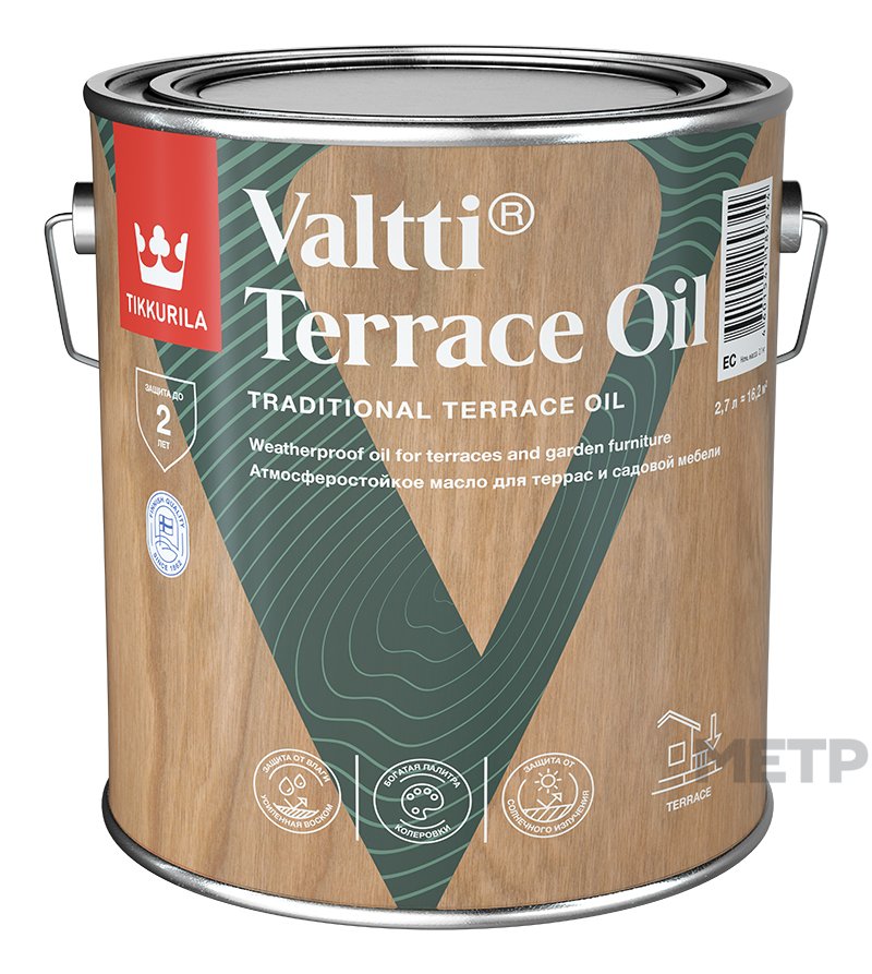 Органоразбавляемое масло, содержащее воск, для защиты и отделки деревянных поверхностей снаружи помещений. В состав Tikkurila Valtti Terrace Oil входит натуральное масло, которое глубоко проникает в структуру древесины и защищает ее изнутри. Благодаря входящему в состав воску, масло обладает отличными водоотталкивающими свойствами и стойкостью к моющим средствам. Масло Tikkurila Valtti Terrace Oil содержит добавки, которые защищают древесину от плесени, грибков и водорослей.