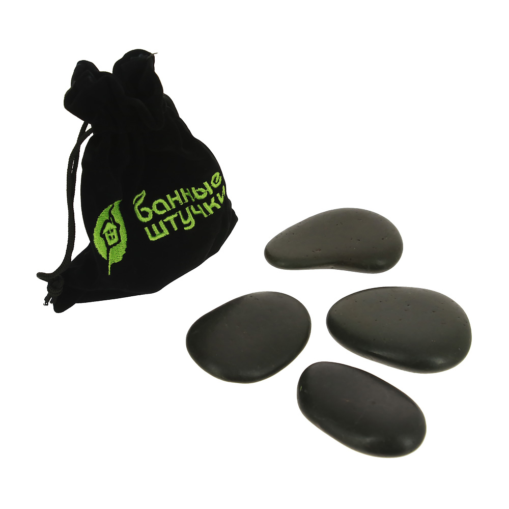Массажер Банные штучки с натуральным камнем. Камни 7х5 см выполнены из базальта. Массаж теплыми или горячими камнями идеально снимает напряженность в мышцах, усталость и стресс. Камни необходимо разогреть до 40С и для лучшего эффекта на кожу нанести ваши любимые эфирные масла (ромашковое, лавандовое и т.д). Во время оздоровительной процедуры желательно включить расслабляющую музыку. После каждого сеанса рекомендуется обработать камни мыльным раствором и промыть в проточной воде. Использовать массажные камни можно для банных процедур в сауне или дома. Противопоказаны беременным женщинам, а также при некоторых травмах и заболеваниях кожного покрова.