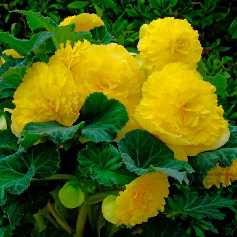 Многолетник Бегония Фимбриата Желтый клубневая. Куст бегонии вырастает до 40 см в высоту. Бутоны желтые, махровые, волнистые по краю лепестка, 15 см в диаметре, похожи на георгин. В открытом грунте цветет 2-3 недели, а в комнатных условиях цветет 1 месяц. Растение любит солнце и полутень (примерно 15-25 С). Место для посадки лучше выбрать безветренное. Поливать необходимо умеренно и пульверизовать воздух рядом с цветком, но чтобы вода не попадала на листья. Во второй половине февраля достать из хранения на солнечное и теплое место, начать скромный полив до появления ростков, посадить в горшок (диаметр 10-15 см) или в открытый грунт в июне, когда земля уже прогреется. Грунт требуется легкий, плодородный, со слабокислой реакцией, с нижнем слоем дренажа. Для развития и укрепления бегонии необходимо её подкармливать раз в две недели. В начале осени завершить полив, удалить растения, а клубни убрать на хранение в прохладное место (7-9 С) в торф или песок, сохранять их влажными, до весны. Если цветок рос в горшке, то клубни оставить в горшке и иногда (редко) увлажнять землю. Размножение: семена, черенки, разделение клубней.