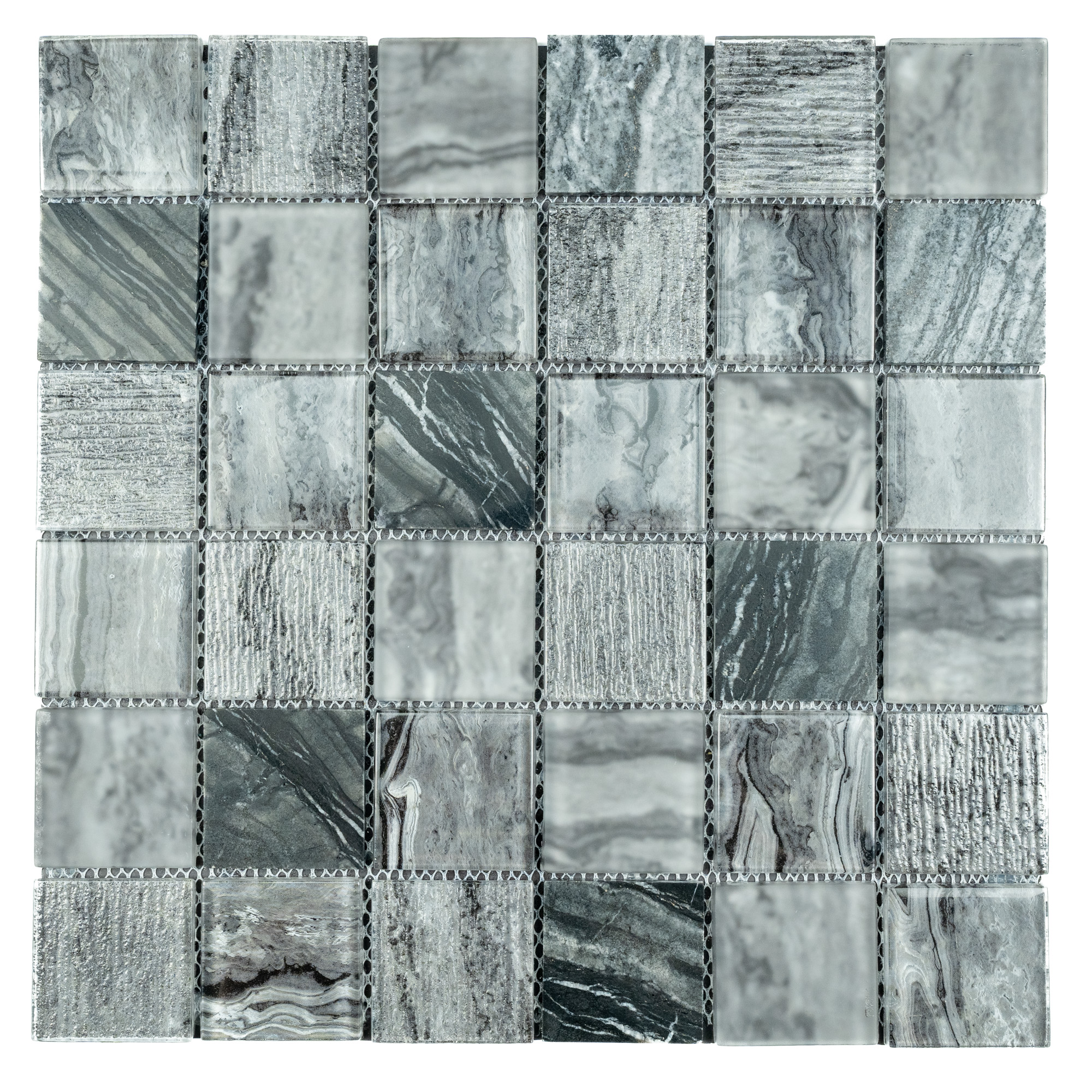 Мозаика Uland Coal Glass - это сочетание классического белого и темно-серого тона. Стеклянные квадраты разных узоров в сочетание с структурной каменной поверхностью придадут интерьеру индивидуальность. А гибкая сетка позволит клеить мозаичные полотна на колонны или угловые участки.