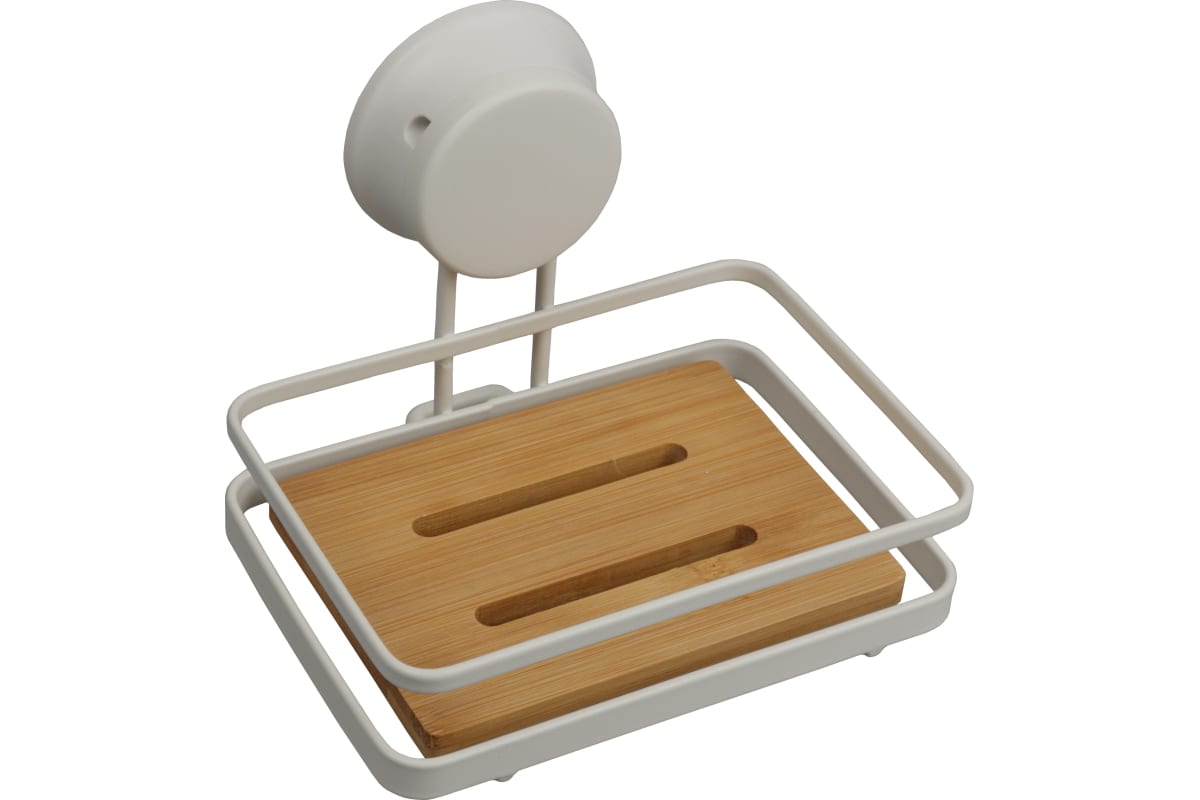 Мыльница на присоске. Стальная проволока с порошковым покрытием, бамбук, присоска из термопластичной резины и АВС-пластика. Максимальная нагрузка до 2 кг. Размер корзины: 13.5х9.5х3,5см
