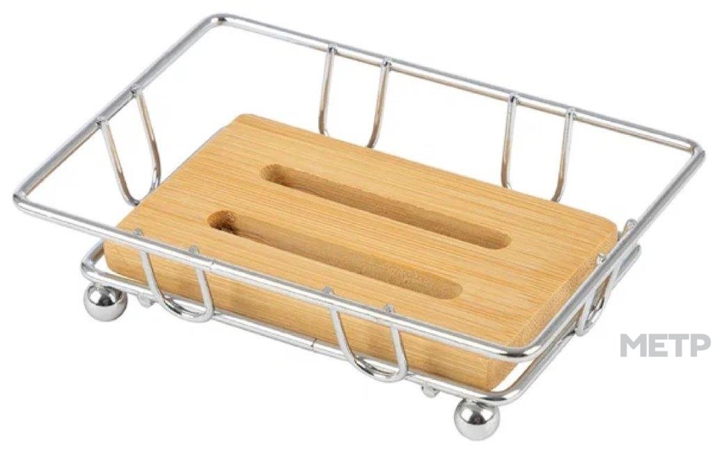 Мыльница Размер:L 12.40 W 8.30CM H 3.20CM Вес: 80 гр Материал: хромированный металл, бамбук