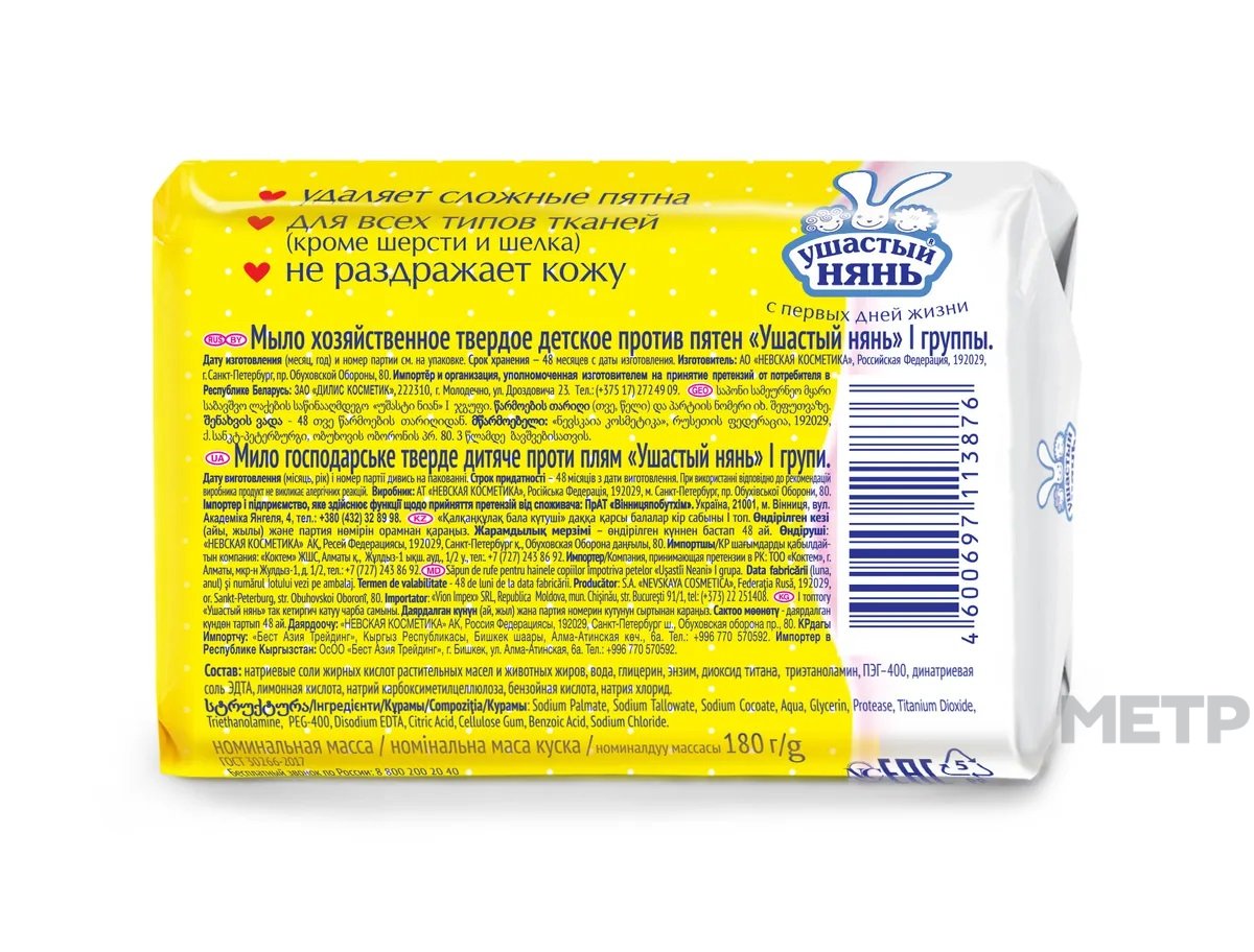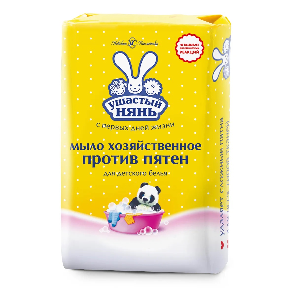 Мыло хозяйственное Ушастый Нянь Против пятен 180 г подходит бля белого и цветного детского белья. Удобен, когда необходимо быстро застирать пятно на ползунках, пеленках, трусиках. Энзим в составе предназначен специально для удаления белковых пятен с ткани. А глицерин смягчает и увляжняет кожу рук.