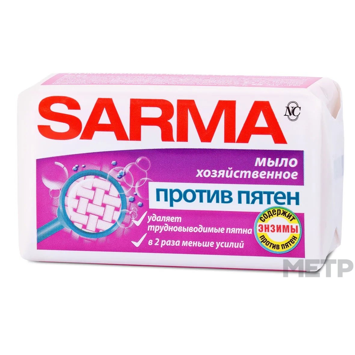 Мыло хозяйственное Сарма Против пятен 140 г используется для мытья посуды, рук и для стирки. Мыло справляется с удалением трудновыводимых и застарелых пятен. Подходит для цветных тканей, особенно хорошо справляется с пятнами от молока, крови и травы. Не сушит кожу рук, благодаря глицерину в составе. Отсавляет после себя приятный аромат.