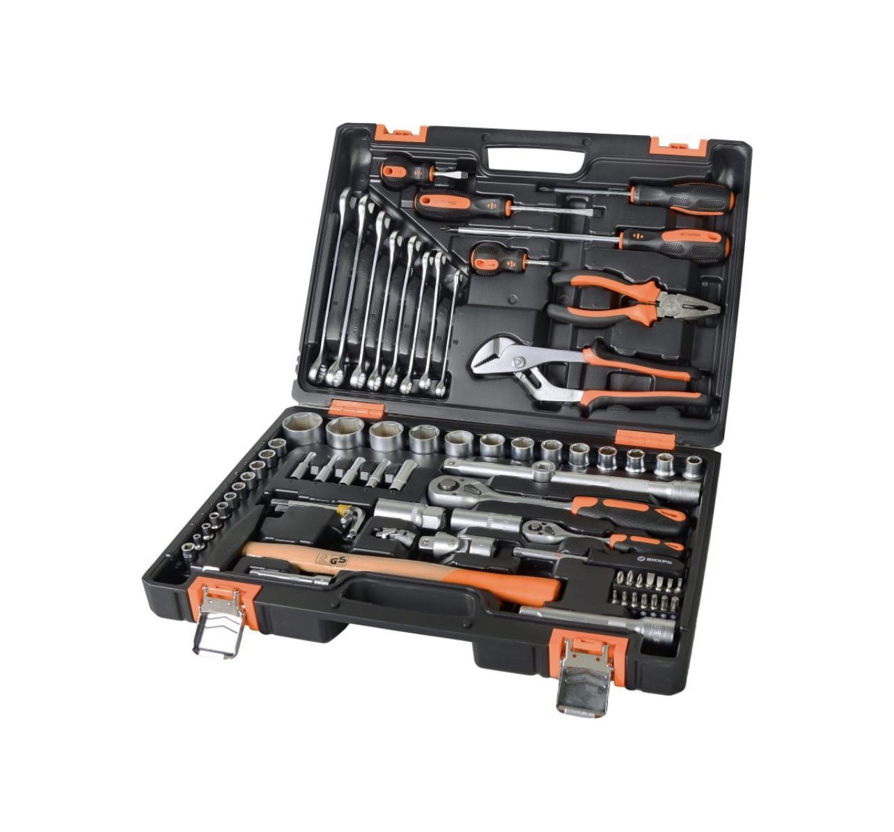 Для слесарных работ в комплекте имеются пассатижи и клещи, а также молоток. Кейс выполнен из пластика, оснащен раздельными петлями и двумя металлическими замками для безопасной транспортировки.