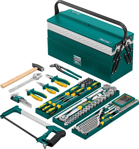 Набор инструмента 131предмет, слесарно-монтажный, это профессиональный комплект инструмента для проведения различных монтажных и слесарных работ. Набор снабжен профилем SUPER-LOCK для переноса пятен контактов с углов граней крепежа к их центру.