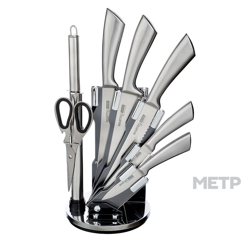Набор кухонных ножей SATOSHI «Мартелл» из 8-ми предметов с хромированными ручками на акриловой подставке содержит все, что нужно для работы по нарезке продуктов на современной домашней кухне. Стильная устойчивая подставка позволяет быстро извлекать нужный предмет и не занимает много места, а дизайнерское исполнение выигрышно дополнит интерьер кухни. Качественная нержавеющая сталь не боится коррозии, долго держит заточку и сохраняет первоначальный вид на протяжении всего срока эксплуатации. Комплект включает мусат для правки режущей кромки, топор для рубки и разделки мяса 16,5 см, поварской шеф-нож 20 см, нож для хлеба 20 см, универсальный 12,7 см, для фруктов и овощей 9 см, а также кухонные ножницы. Все изделия обладают повышенной устойчивостью к механическим воздействиям.