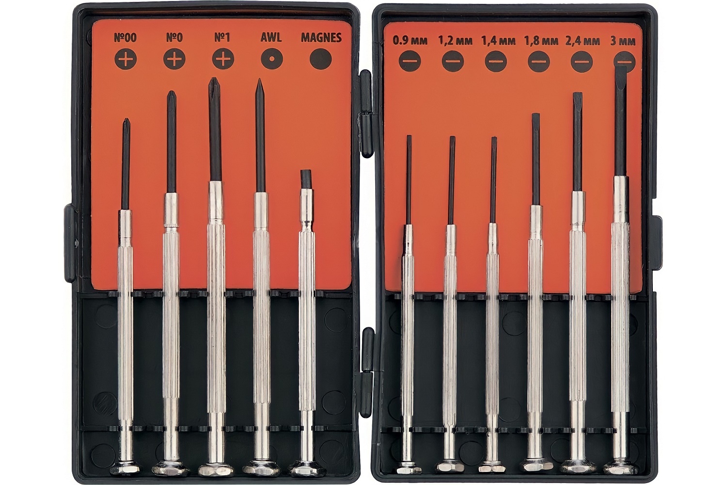 Набор отверток Sparta, в него входит 10 отверток и 1 магнит. Рукоятки отверток металлические, а насадки изготовлены из хромованадиевой легированной стали, устойчивой к ударам и падениям. Тип наконечника отверток крестообразный и прямой. Они предназначены для точных работ. Набор удобен тем, что все отвертки находятся в кейсе. Трещоточный механизм у данных отверток не предусмотрен. Все отвертки разного размера.