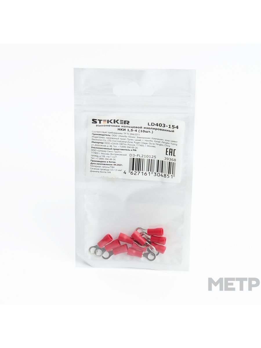 Наконечник кольцевой изолированный НКИ STEKKER 0,5-1,5мм2 10шт. предназначен для оконцевания опрессовкой медных проводов и последующего крепежа наконечников к клеммам электрического оборудования на основе винтовой фиксации. Наконечники выпускаются с изоляцией трех стандартных цветов (красный, синий, желтый). Каждый цвет соответствует определенному диапазону сечения провода.