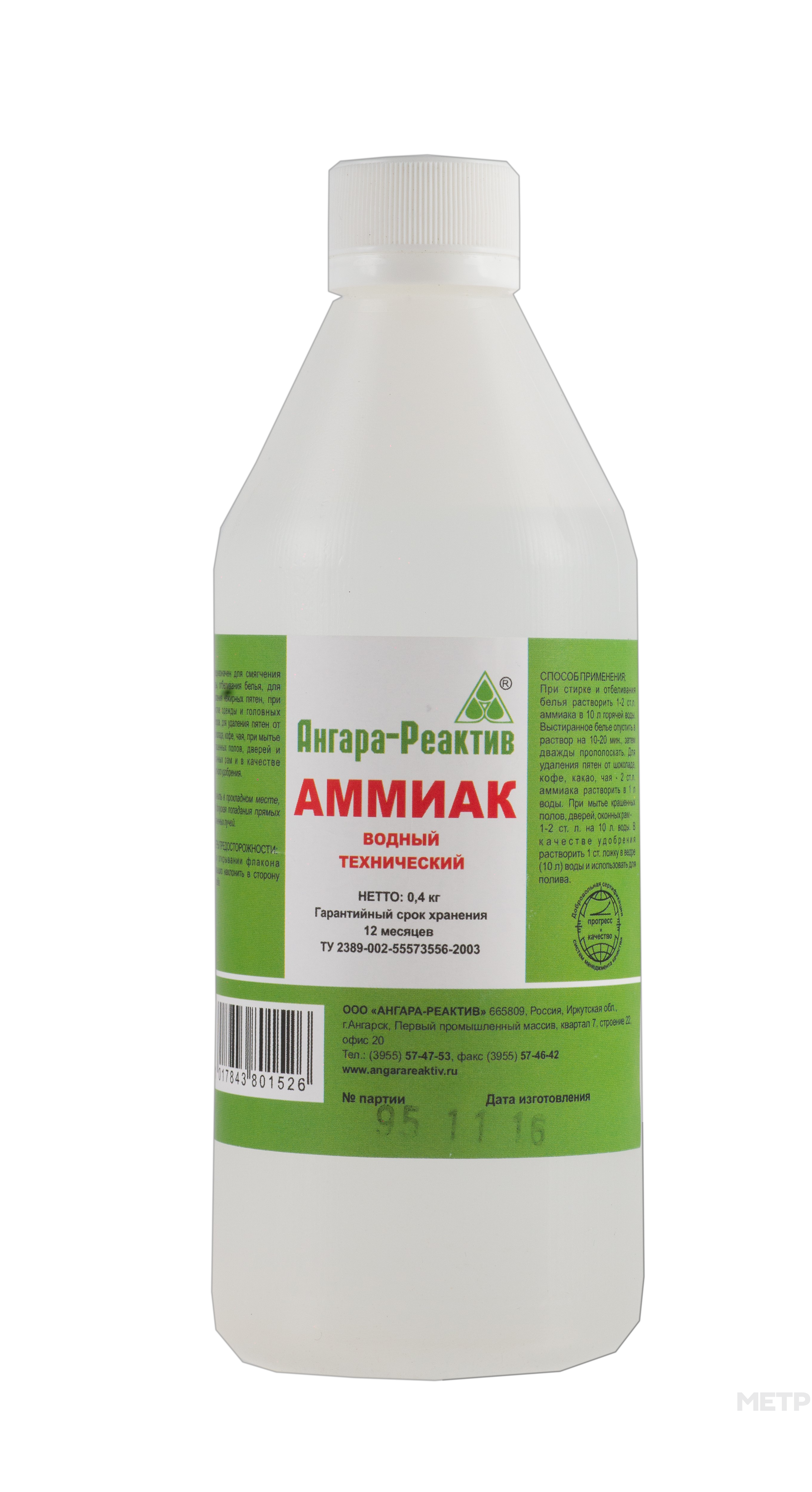 Нашатырный спирт Ангара-Реактив (500 мл) применяется: 1. в сельском хозяйстве в качестве удобрения;2. в производстве для получения красителей, калицинированной соды, изготовления медикаментов; 3. в быту используется для обеззараживания и смягчения воды, отбеливания белья, для удаления нежирных пятен при чистке одежды и головных уборов, удаления пятен от шоколада, какао, чая, при мытье крашеных полов, дверей и оконных рам.