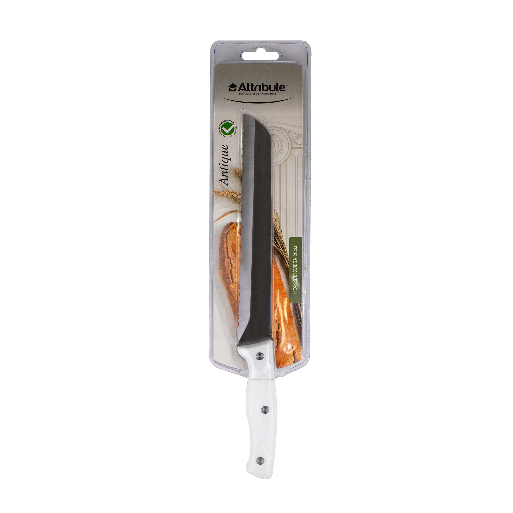 Нож подходит для нарезки хлеба. Лезвие ножа изготовлено из экологически чистой нержавеющей стали, которая обладает высокими антикоррозийными свойствами. Особая заточка позволяет быстро и тонко нарезать хлеб. Форма ножа делает его универсальным, а эргономичная ручка удобно лежит в руке. Ручка дополнительно укреплена вставками из нержавеющей стали.