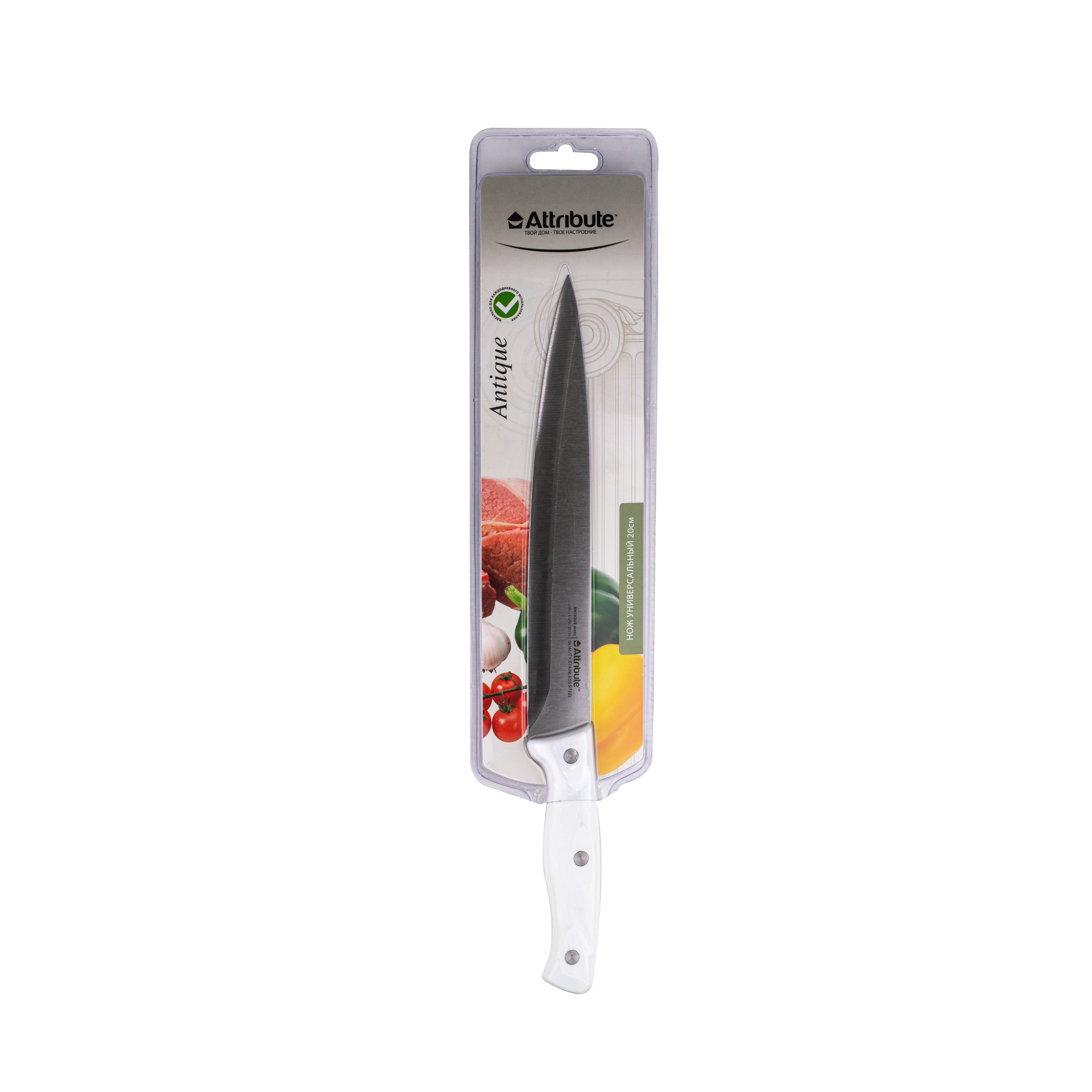Нож универсальный Attribute 20см 1 шт удобное кухонное приспособление для нарезки, шинкования и измельчения. Рабочая часть сделана из нержавеющей стали, а ручка из пластика. Изделие комфортно держать в руке. Ручка имеет упор для пальцев для безопасного использования.