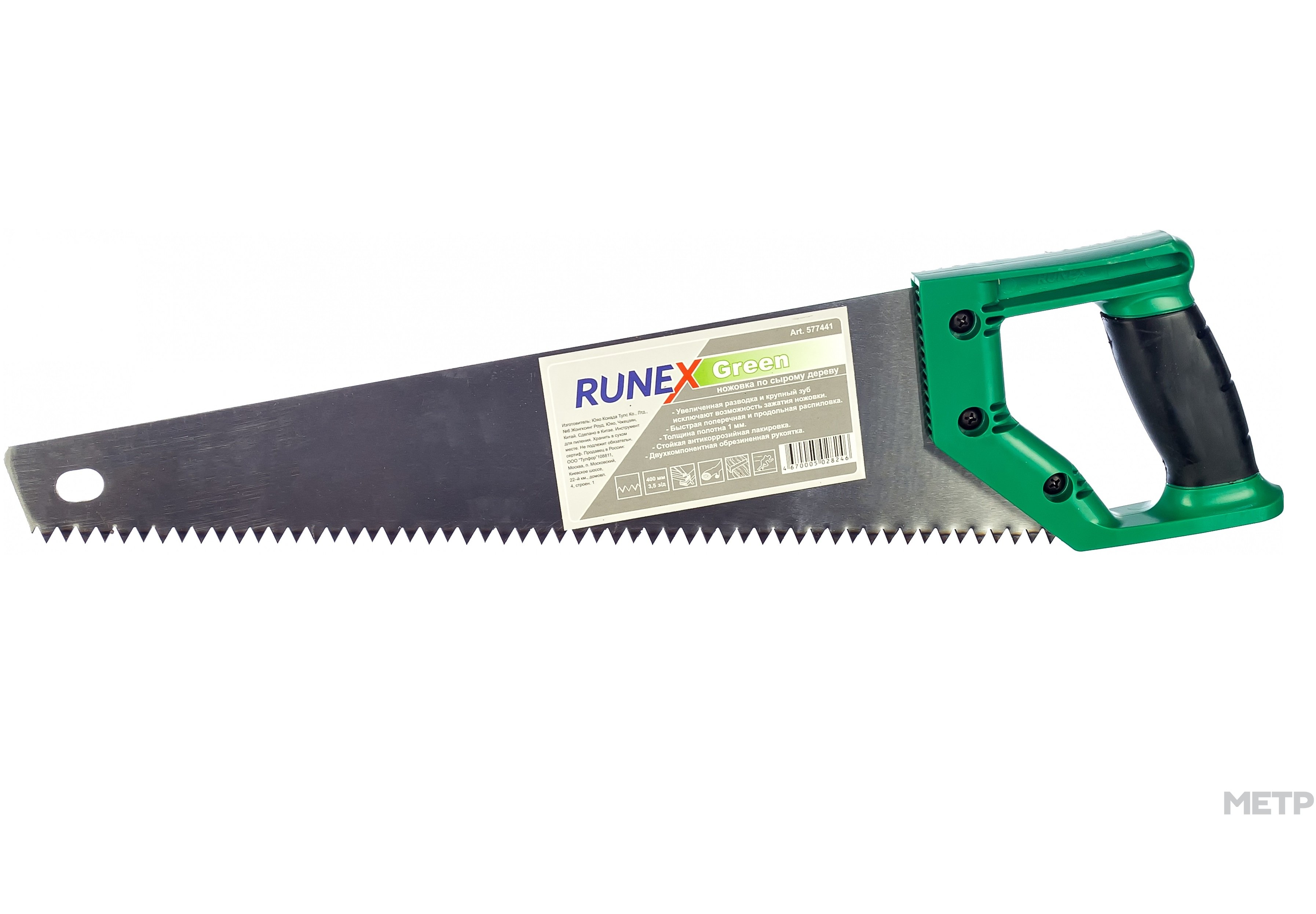 Ножовка по сырой древесине Runex Green 400мм прямой крупный зуб, подойдет для продольной и поперечной распиловки. Увеличенная разводка и крупный прямой зуб исключают зажатие полотна в сырой древесине. Рабочая часть выполнена из пружинной стали с лакированным покрытием, защищающим инструмент от коррозии. Двухкомпонентная рукоятка не скользит во время работы.
