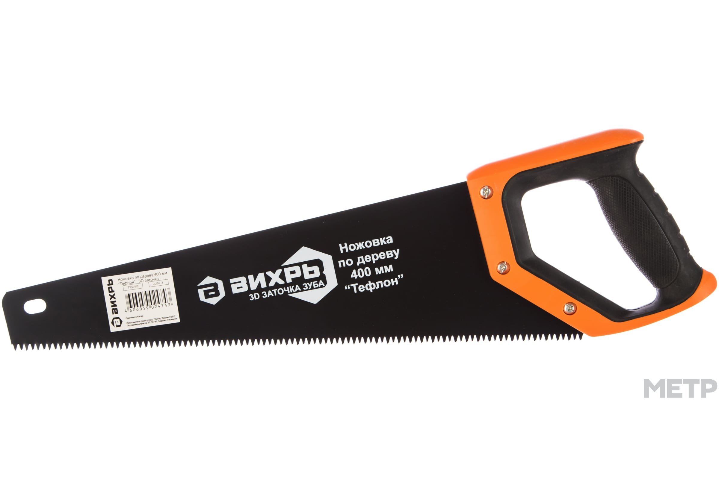 Ножовка столярная по дереву 400 мм Вихрь Тефлон (есть соответствующее покрытие) с заточкой 3D, семью зубьями на дюйм, установленный шаг три миллиметра. Инструмент рассчитан на длительное использование при выполнении профессиональных строительных/отделочных/ремонтных работ.