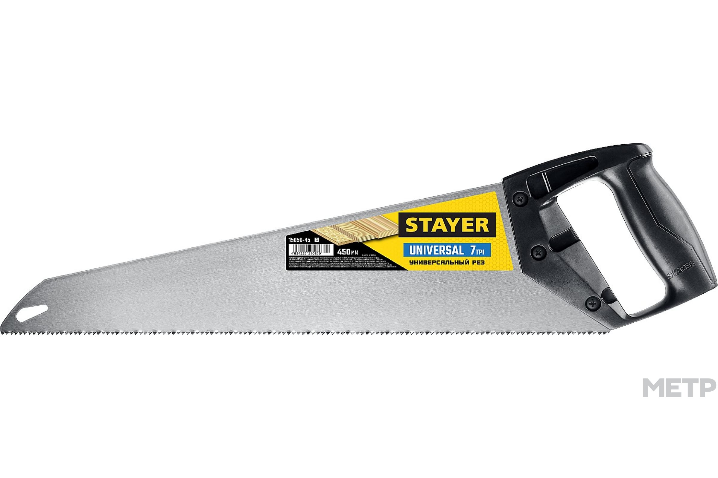 Ножовка столярная по дереву 450 мм STAYER Universal, имеет по семь зубьев на каждый дюйм рабочей поверхности (дистанция три миллиметра), рукоятка сделана из пластика. Высокое качество этой ножовки, изготовленной на современном оборудовании, гарантировано производителем. Практичность и обиходность!