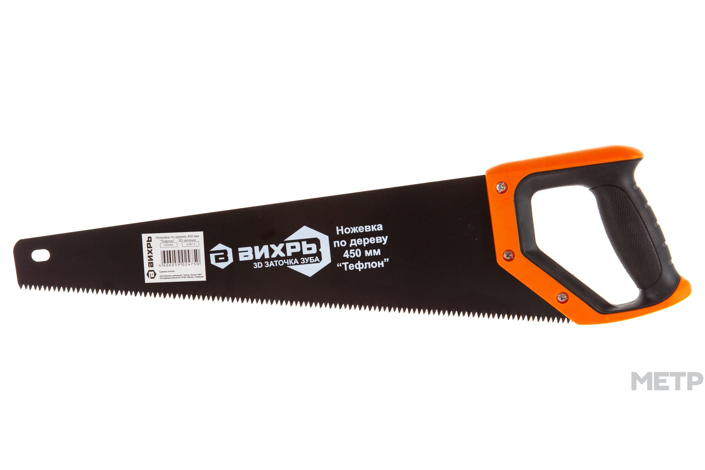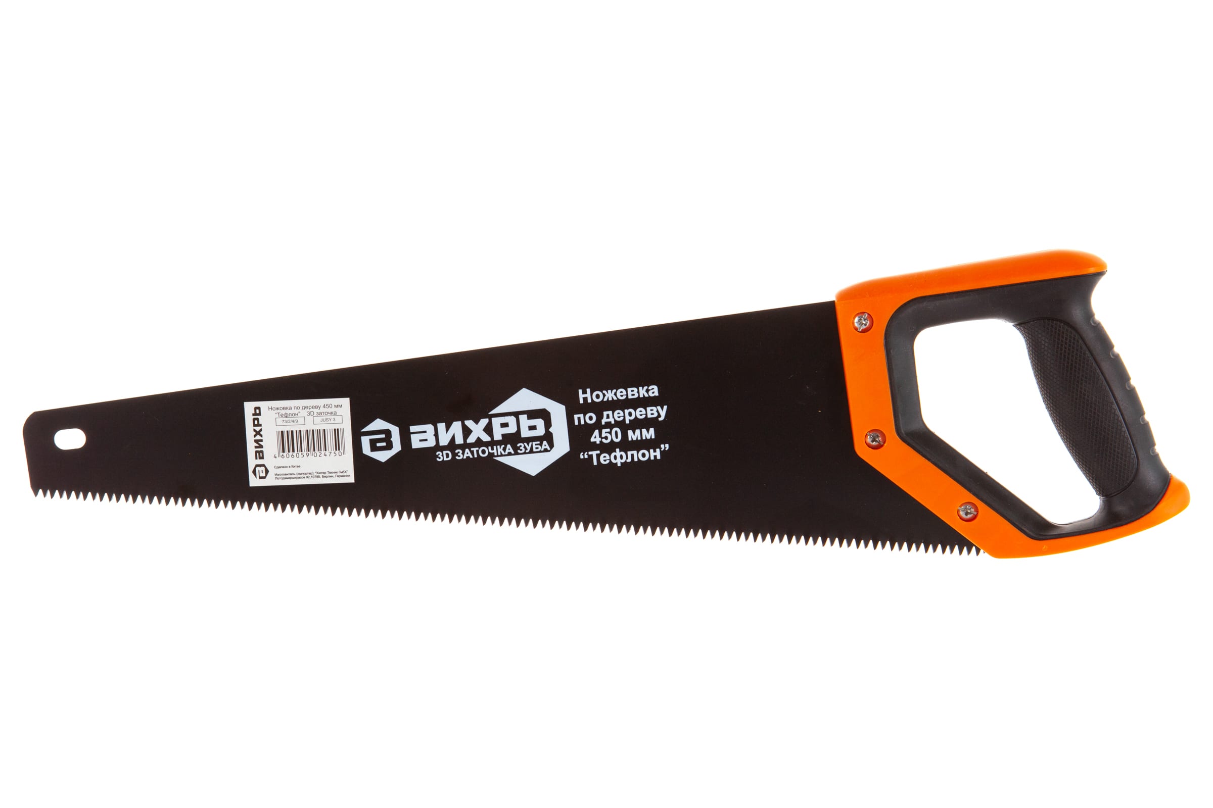 Ножовка столярная по дереву 450 мм Вихрь Тефлон со специальным покрытием, 3D заточкой, пластиковой рукояткой. Количество зубьев на дюйм рабочей поверхности полотна семь, шаг между каждым три миллиметра. Профессиональная модель, устойчивая к износу и рассчитанная на продолжительную эксплуатацию.
