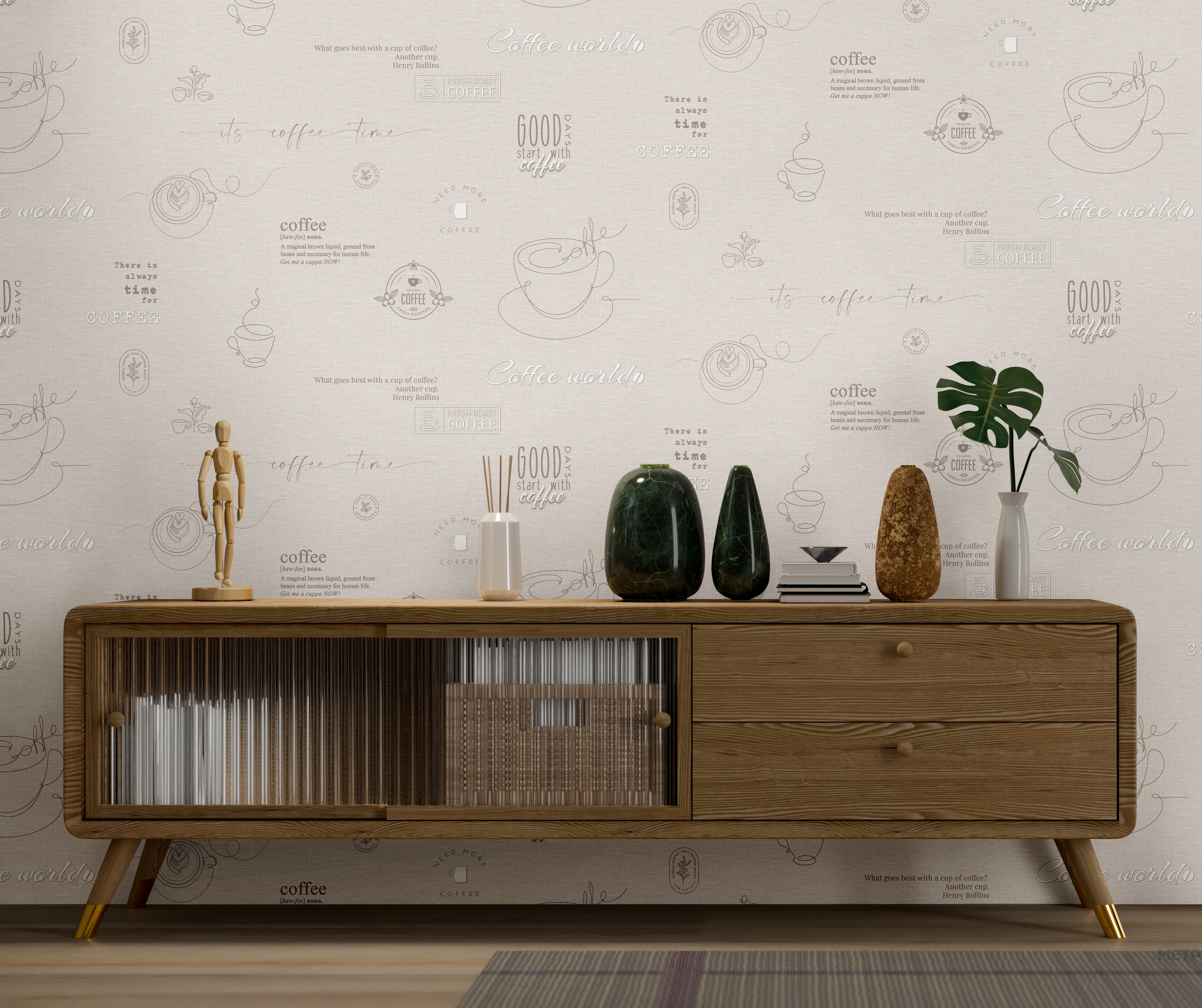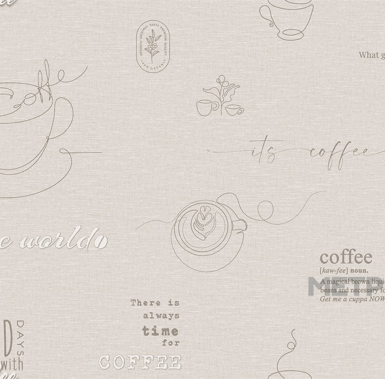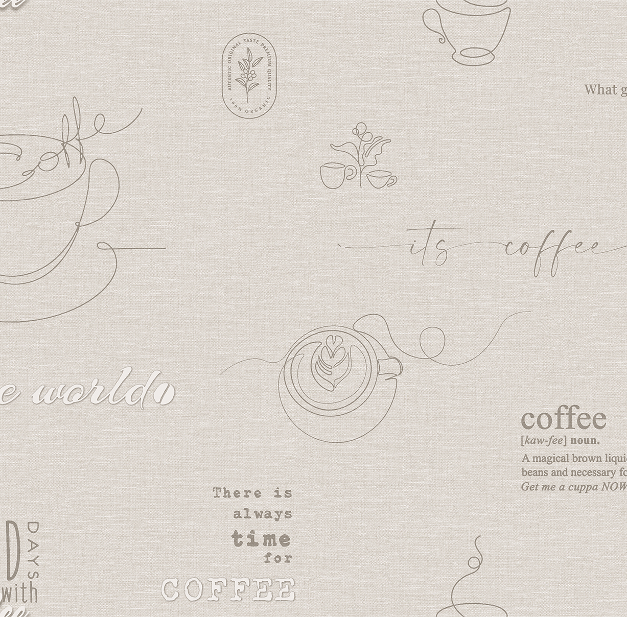 Обои Ateliero Cafe 589692 представляют собой стильное отражение утреннего ритуала, когда аромат только что сваренного кофе наполняет пространство теплом и вдохновением. На фоне мягкой текстильной текстуры изображены графические силуэты чашек, кофейные листья и каллиграфические надписи, создающие атмосферу уюта и непринужденного общения. Обои выполнены в нейтральной природной палитре с оттенками серого, льняного и теплого бежевого, что делает их идеальными для интерьеров сдержанного и сбалансированного дизайна. Элементы принта выглядят легкими и ненавязчивыми, как будто это наброски в блокноте бариста. Обои из коллекции Café прекрасно подойдут для обеденной зоны, кухни, кафе, пекарни или домашней столовой. Они создадут уютную и «вкусную» атмосферу, идеально подходя для тех, кто хочет превратить интерьер в пространство отдыха и вдохновения. Ощутите тепло и комфорт вместе с коллекцией Café от ТМ Ateliero!