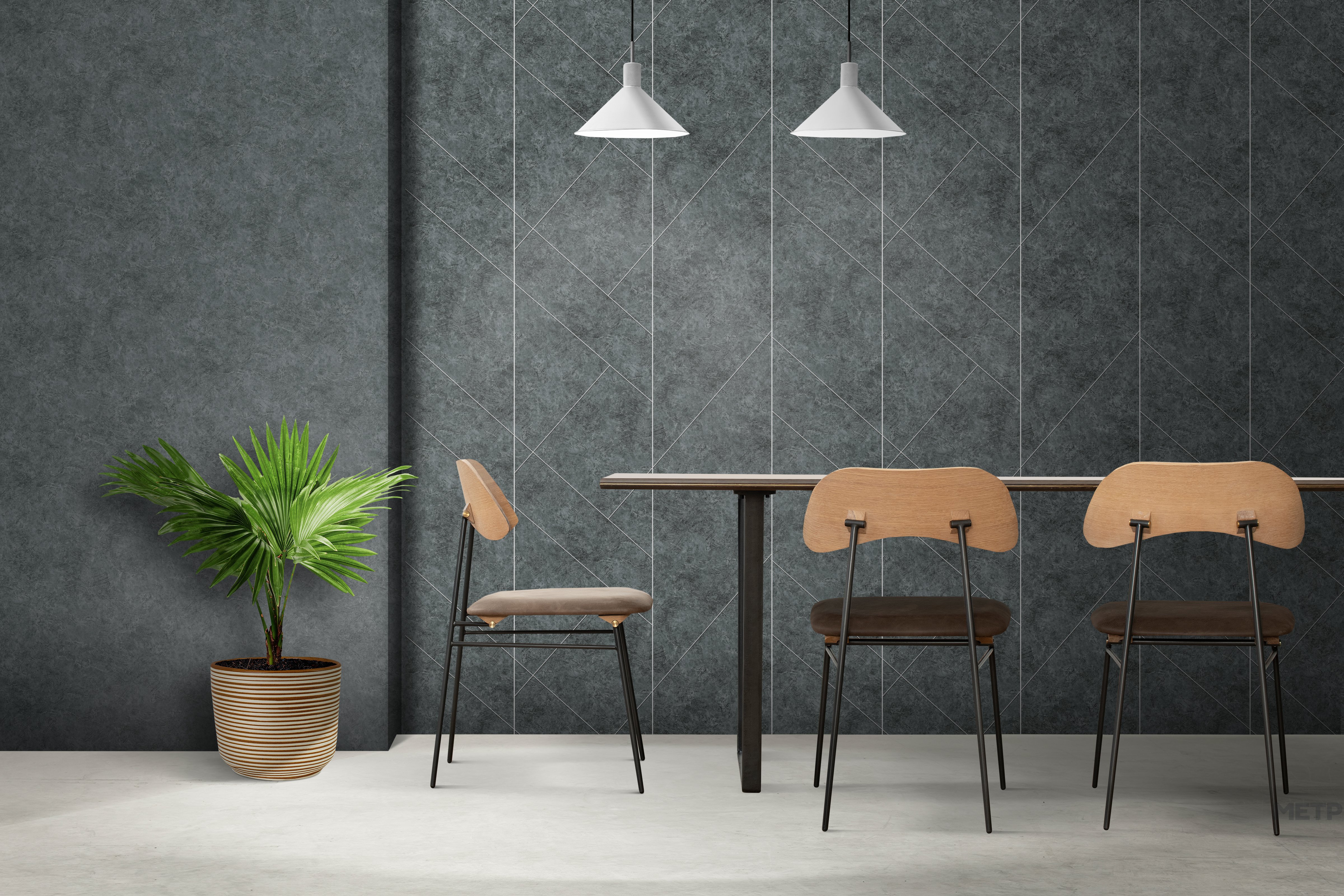 Тонкие контуры спецэффектов с матовым металлическим и мерцающим блеском придают бетонной основе новую интерпретацию: геометрия выходит на первый план, и паттерн обретает стильный образ и четкую направленность.