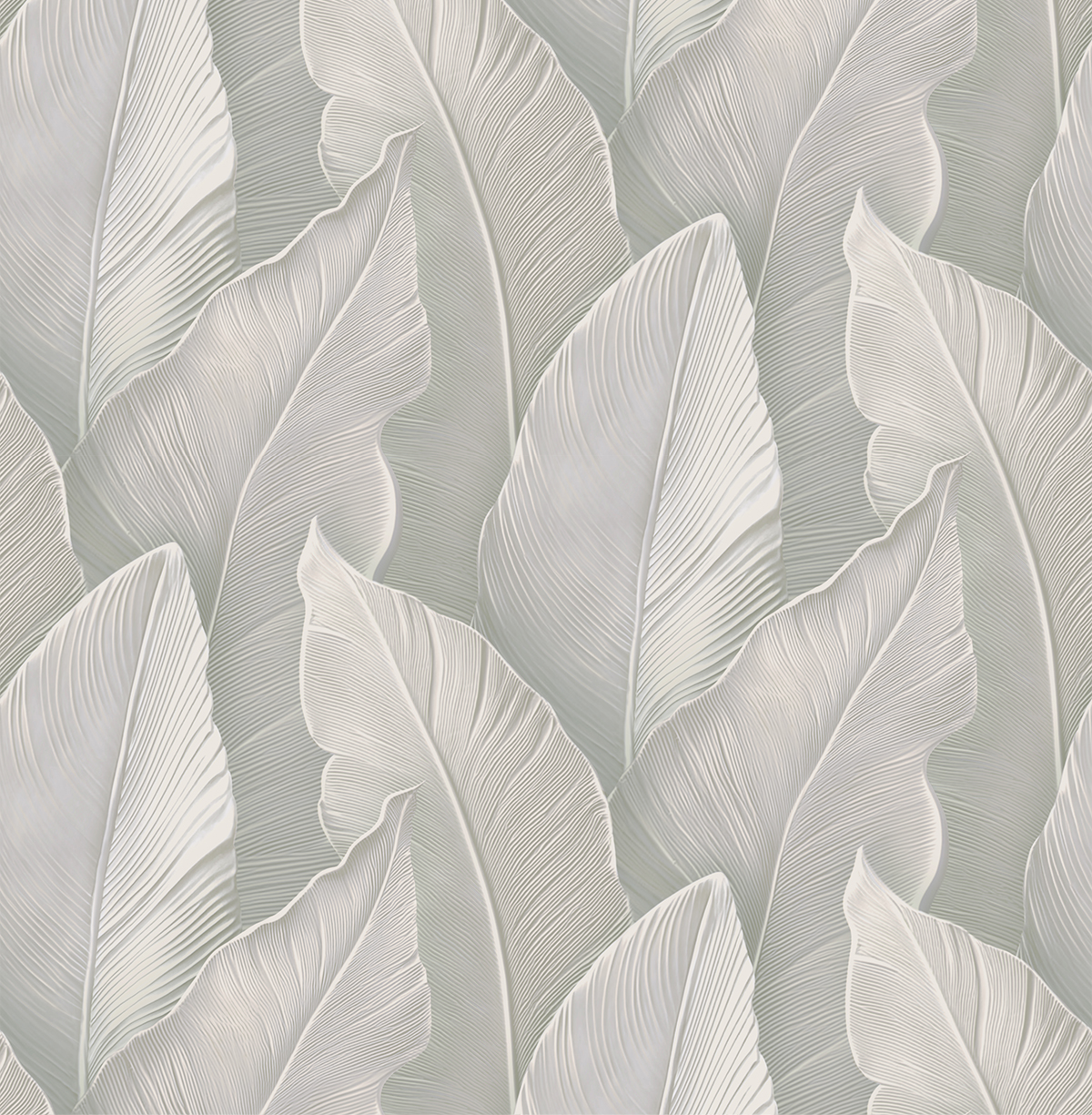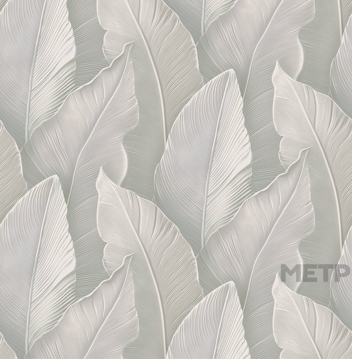 Обои Victoria Stenova Yamaika 588833. "Крупный масштаб, тщательно продуманная композиция и природная эстетика превращают обычную стену в настоящее произведение искусства. Коллекция YAMAIKA от Victoria Stenova отражает современный тренд ""новой роскоши"" — это выбор для тех, кто ценит баланс между смелыми визуальными решениями и истинной элегантностью. Текстурная поверхность с деликатным рельефом усиливает трехмерность изображения, создавая игру света и тени. Каждому дизайну придает выразительность тонкая проработка деталей — каждый лист словно оживает благодаря объемным линиям прожилок и градиентным переходам. Дизайн завораживает и передает мельчайшие нюансы природной текстуры: листья выглядят так, будто выгравированы на шелковистой поверхности. При дневном свете акцент на графичности рисунка, а при вечернем освещении покрытие приобретает мягкое, почти перламутровое сияние. Модная палитра оттенков делает этот смелый растительный принт актуальным решением для разных поколений. Еще одно преимущество коллекции — фоны с интересной и равномерной текстурой, которые можно клеить без подгонки!