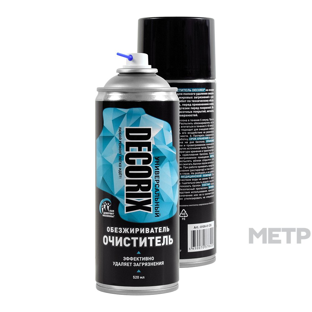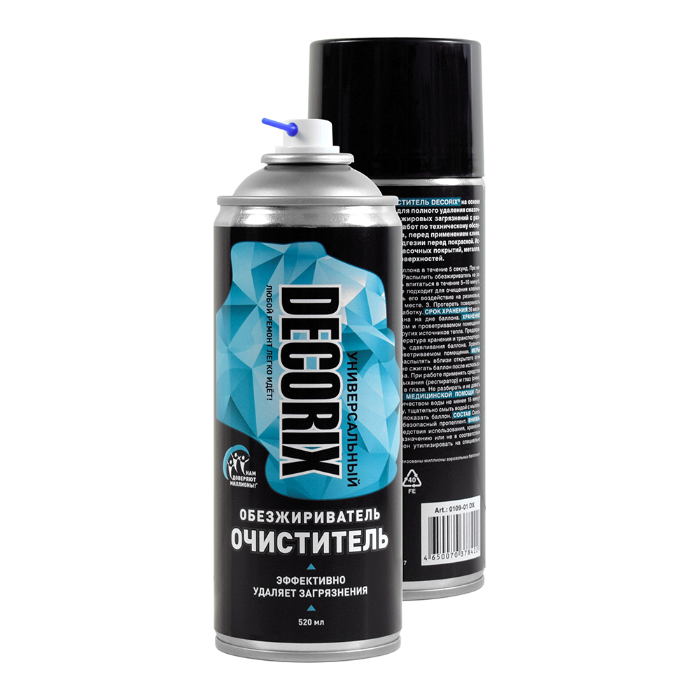 Аэрозольный обезжириватель-очиститель DECORIX® (520 мл) на основе неагрессивных растворителей предназначен для полного удаления смазочных материалов, грязи, гудрона, масляных и жировых загрязнений с различных поверхностей. Применяется во время работ по техническому обслуживанию и ремонту узлов машин и механизмов, перед применением клеев, герметиков, мастик, а также для увеличения адгезии перед покраской. Используется для обезжиривания старых лакокрасочных покрытий, металла, пластмасс, загрунтованных и шпатлёванных поверхностей.