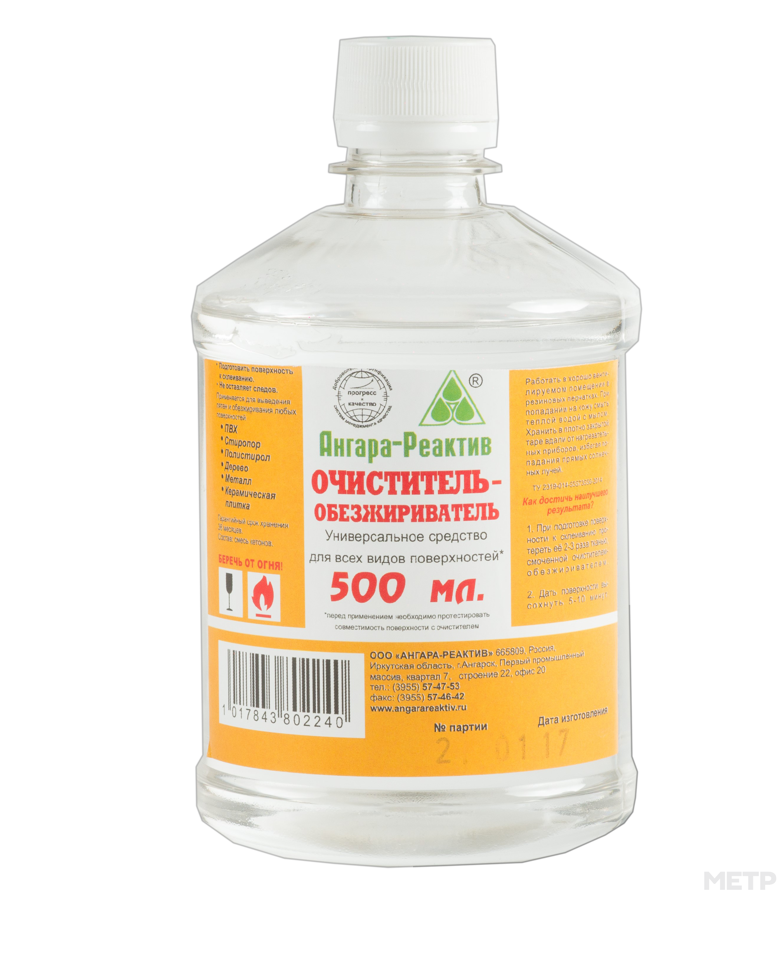 Очиститель-обезжириватель Ангара-Реактив (500 мл) удаляет машинное масло, смазочные вещества, гудрон, воск, резиновую грязь, силиконы и остатки клея. Основные области применения таких средств – это обезжиривание листового металла, удаление наклеек и остатков клея, предварительная обработка склеиваемых поверхностей и очистка поверхностей от старой смазки