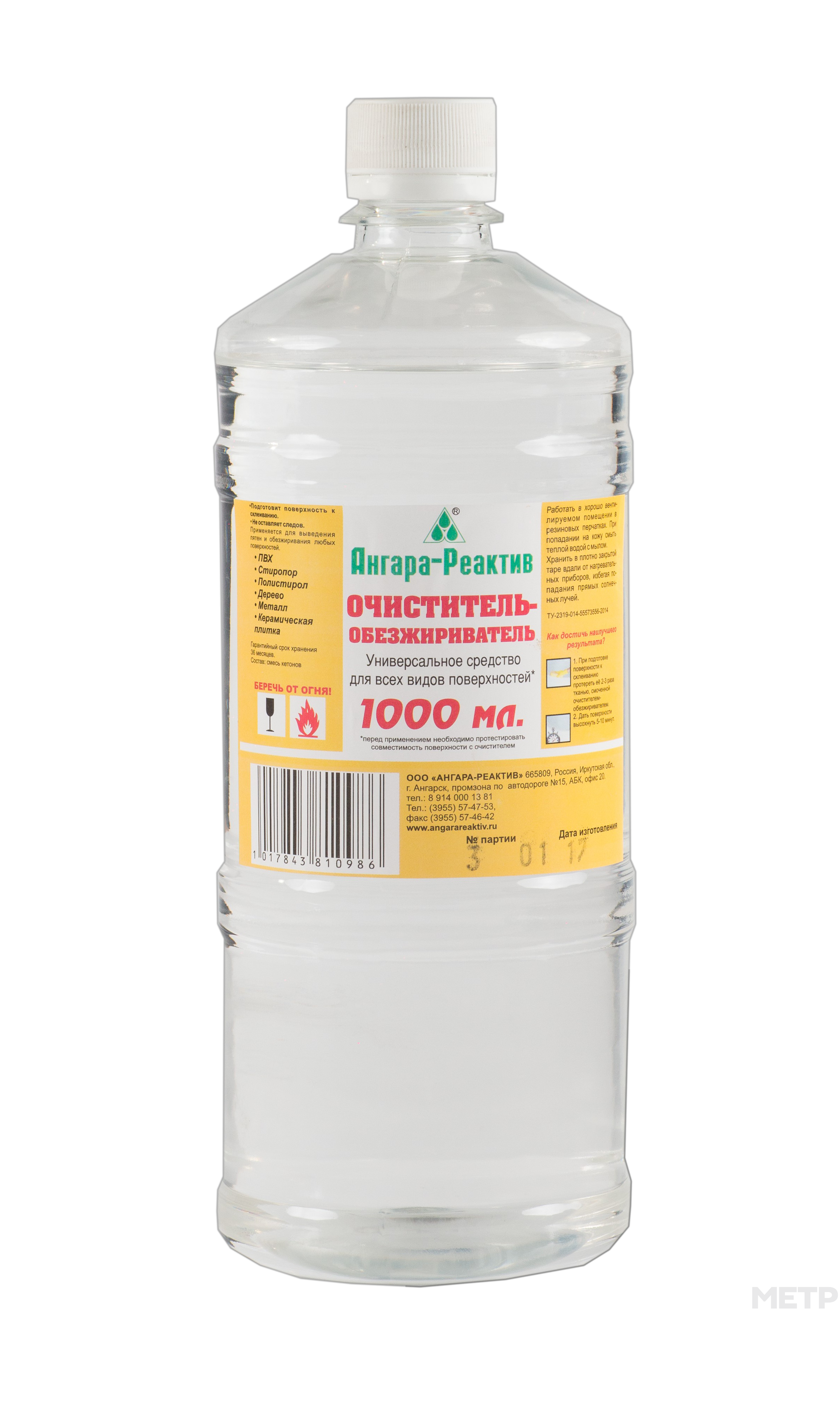 Очиститель-обезжириватель Ангара-Реактив (1 л) удаляет машинное масло, смазочные вещества, гудрон, воск, резиновую грязь, силиконы и остатки клея. Основные области применения таких средств – это обезжиривание листового металла, удаление наклеек и остатков клея, предварительная обработка склеиваемых поверхностей и очистка поверхностей от старой смазки