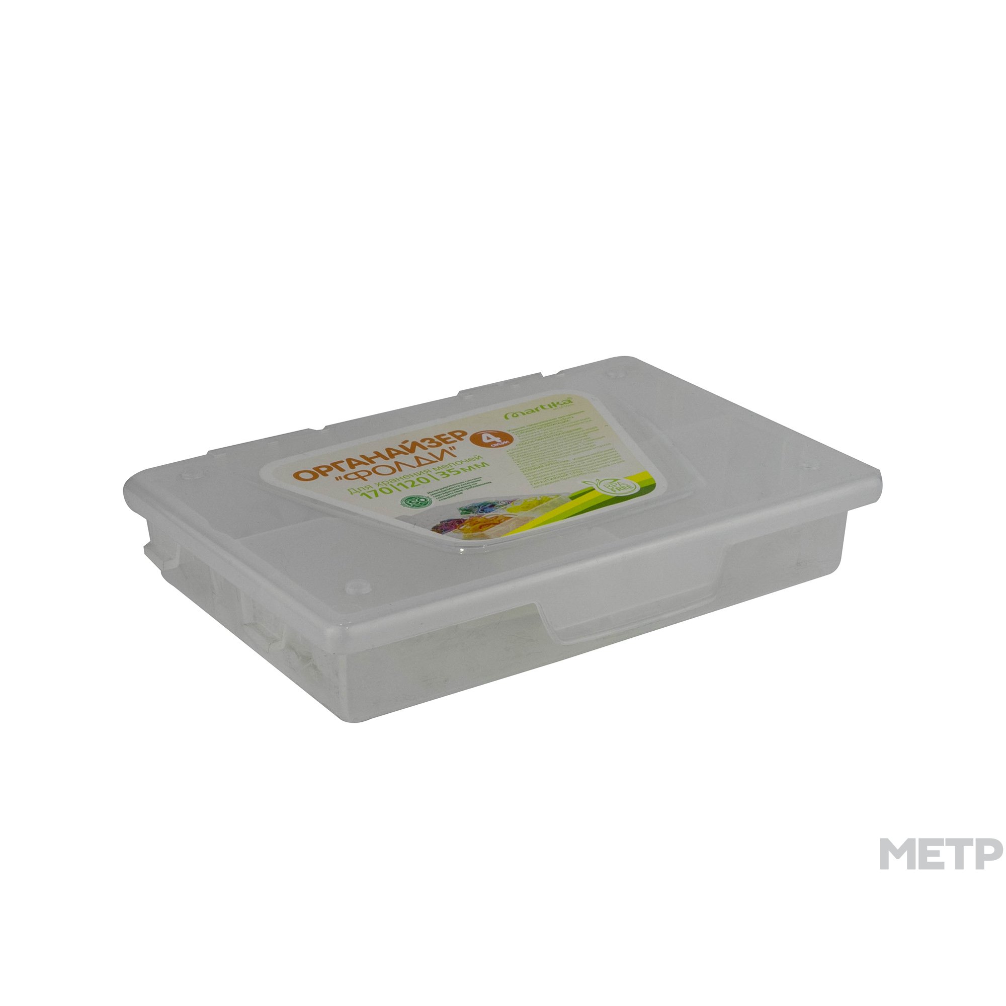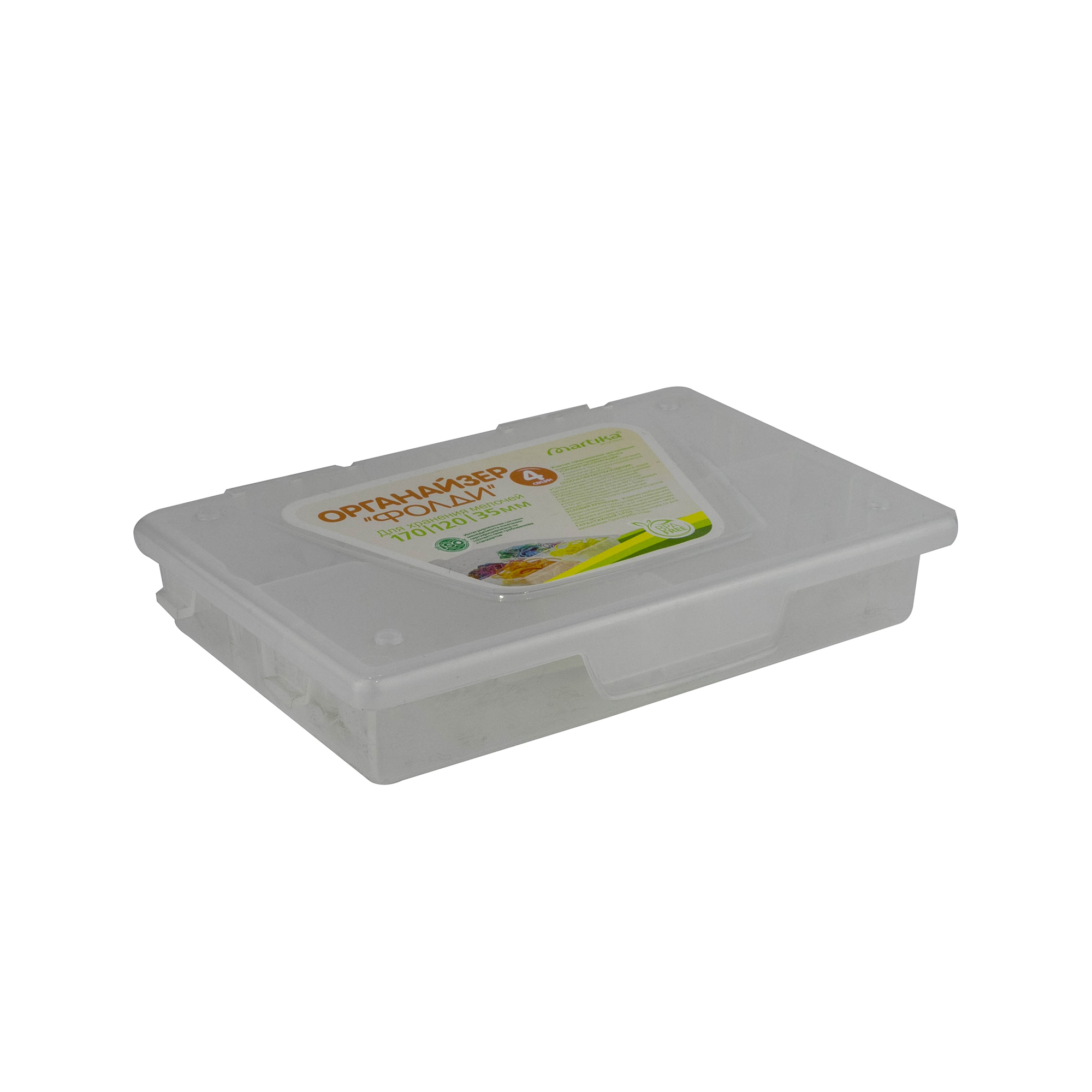 Органайзер «Фолди» предназначен для компактного хранения и переноски различных мелких предметов: швейных и рыболовных принадлежностей, медикаментов, крепежных изделий и мелких инструментов, карандашей и фломастеров. С помощью съемных перегородок можно легко менять размер отделений. Отделения органайзера позволят систематизировать мелкие предметы, а прочный замок-защелка обеспечит плотное закрывание крышки.