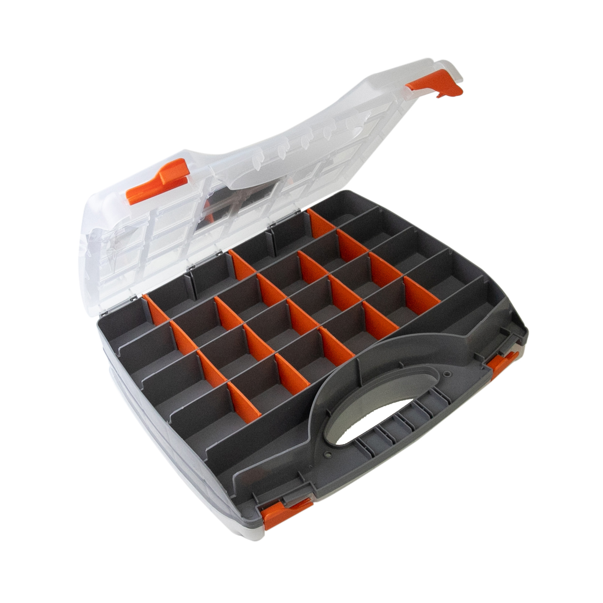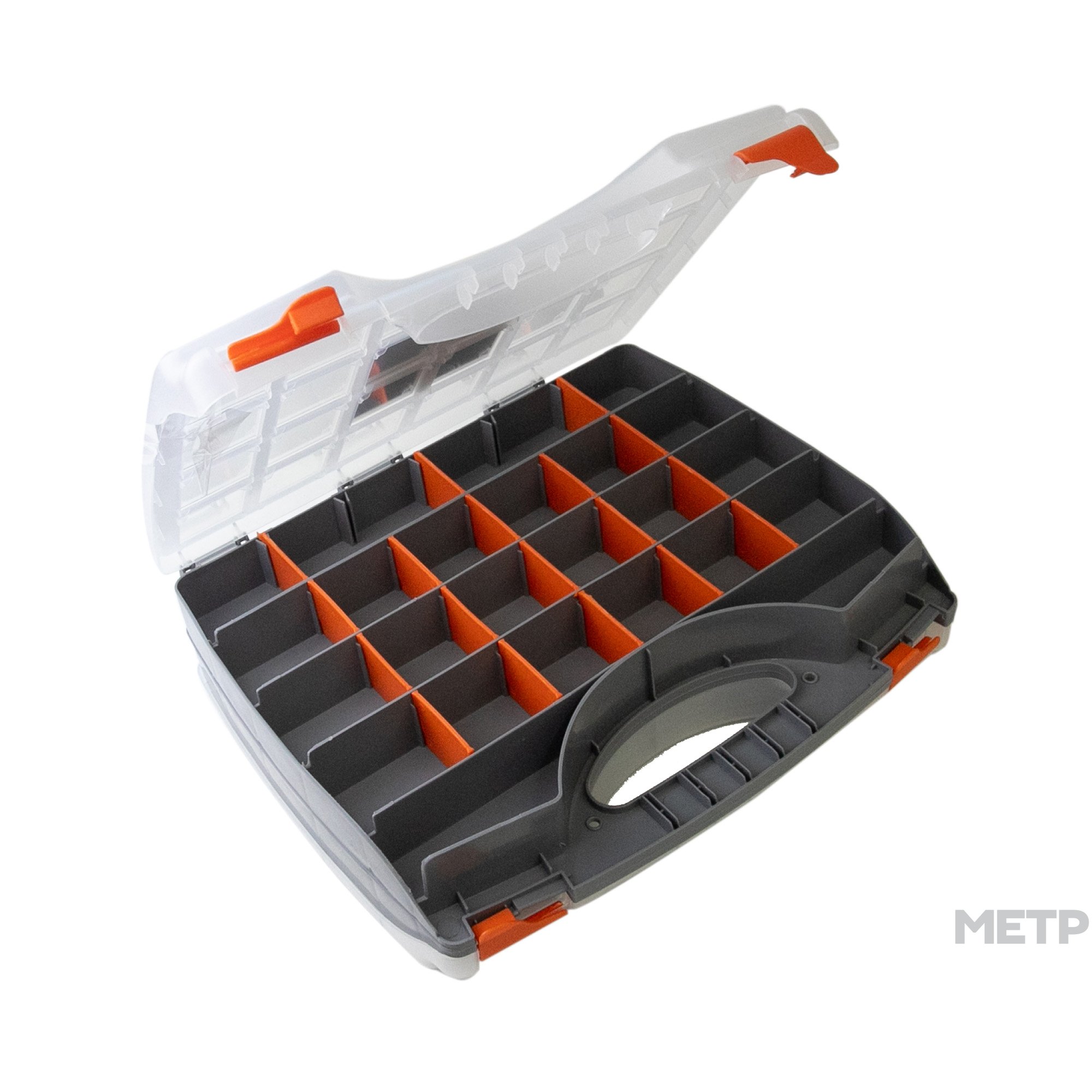Органайзер STELS 32,5*28*8,5 см двусторонний имеет 26 отделений с каждой стороны. Полипропиленовый корпус предотвращает попадание пыли и влаги внутрь органайзера. Каждая секция регулируется по размеру. Пластиковые замки и ручка позволяют легко транспортировать органайзер в нужное место.