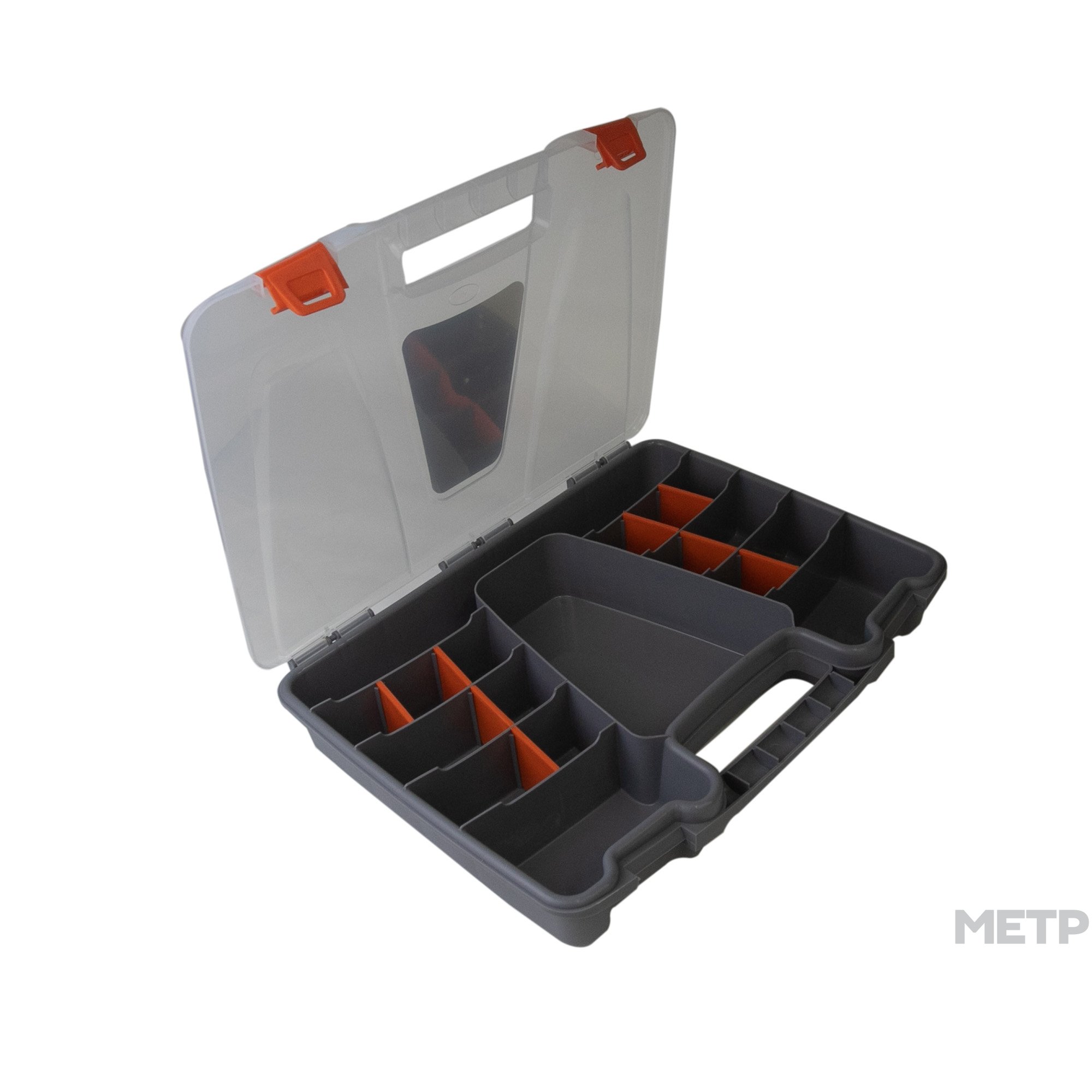 Органайзер STELS 37*28*6 см – это надежная конструкция с регулируемыми отделениями и переставными разделителями для удобного расположения инструментов. Органайзер выполнен из толстого пластика, предотвращающего разбитие инструмента при транспортировке. Удобная ручка позволяет с легкостью перенести органайзер.