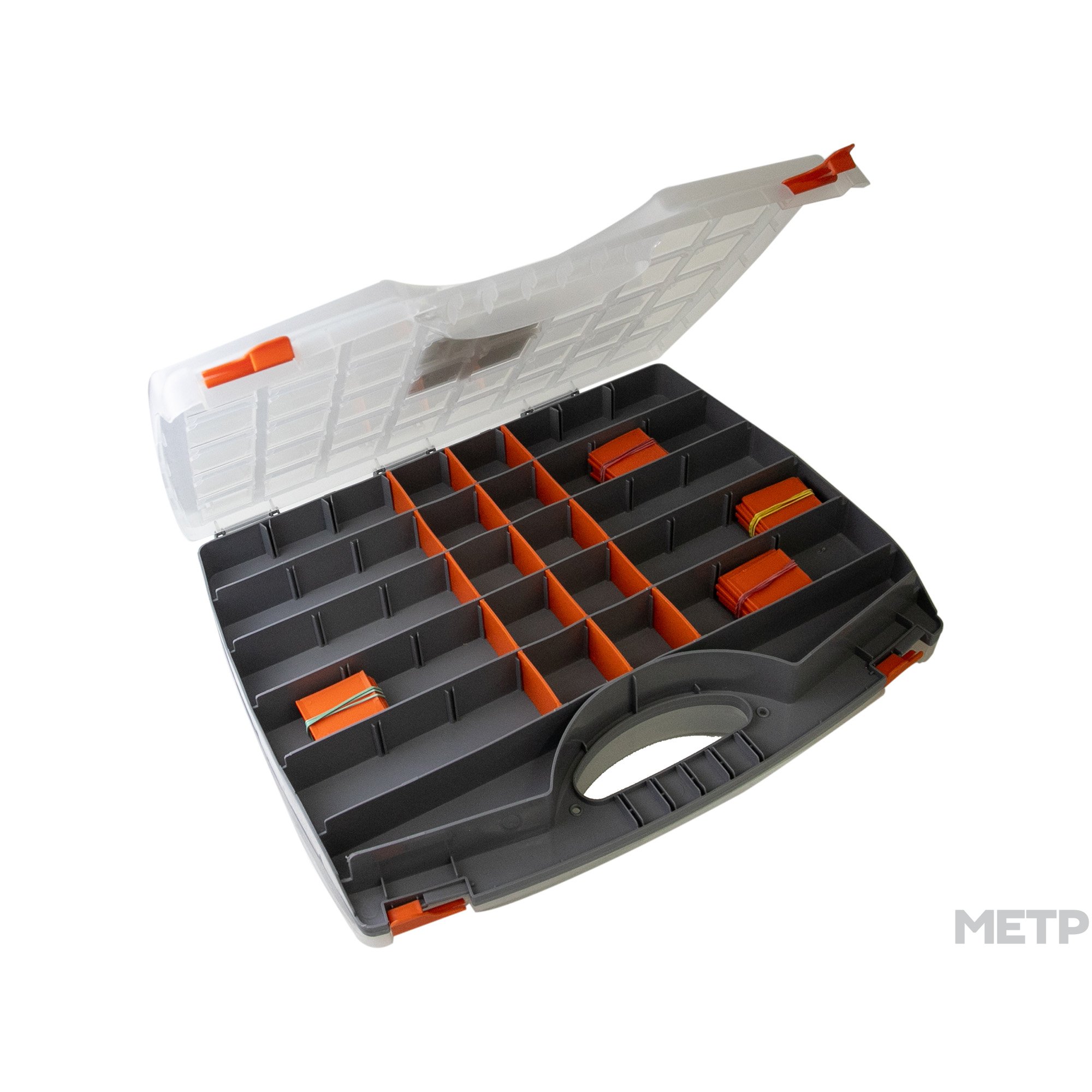 Органайзер STELS 42,5*33*8,5 см прекрасно подходит для выездных работ. Двустороннее размещение создает дополнительные удобства наполнения органайзера. При желании размеры секций можно регулировать по своему усмотрению. Вместительный органайзер имеет 84 секции для хранения мелких и крупных деталей.