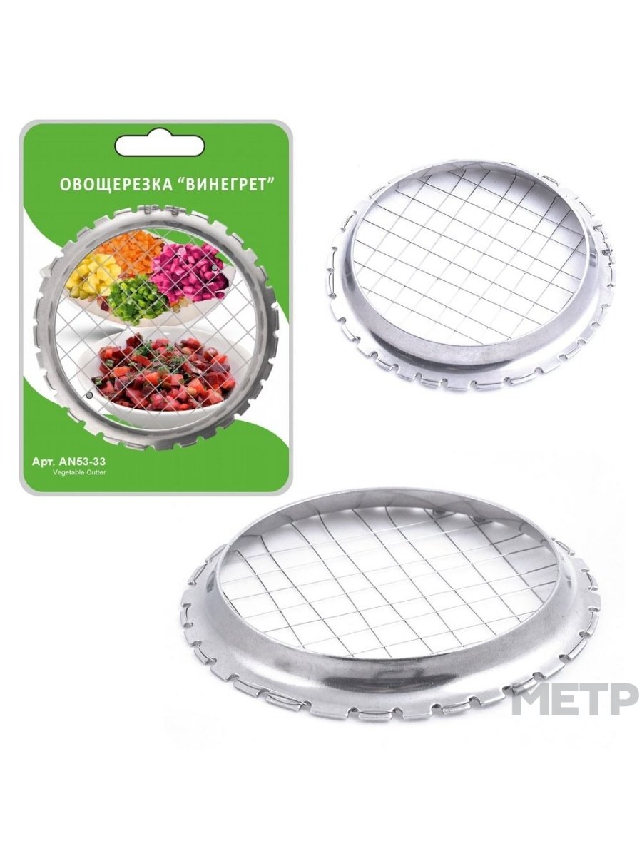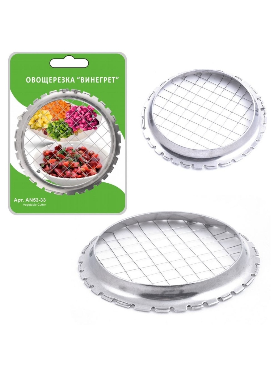Oвощерезка Винегрет AN53-33 выполнена из нержавеющей стали, сам корпус - из стали. Данное изделие поможет вам нарезать вареные фрукты и овощи кубиками. Размер ячейки - 8х8 мм. Широкая кайма позволяет удобно держать изделие во время готовки. Данная овощерезка сделает приготовление салата быстрым и легким.