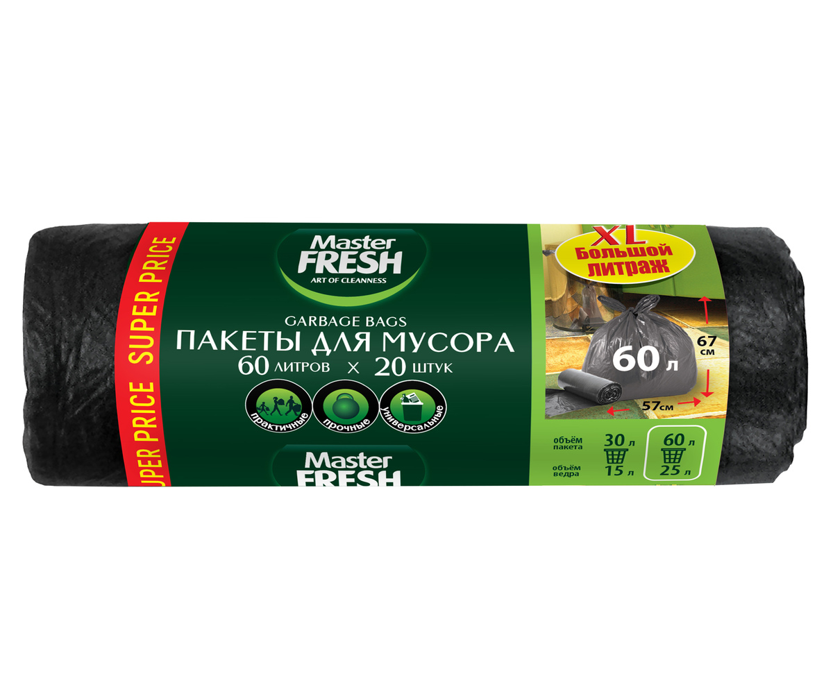 Пакеты для мусора Master FRESH "стандарт" обеспечивают чистоту и гигиену в квартире. Удобны для сбора и вывоза мусора, занимают мало места, практичны в использовании. Широко применяются в быту и на производстве. Специальная перфорация позволяет легко отделить пакет от рулона.