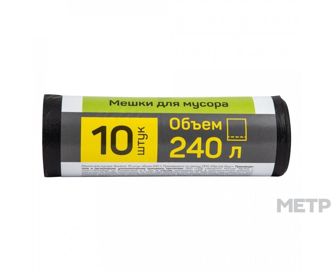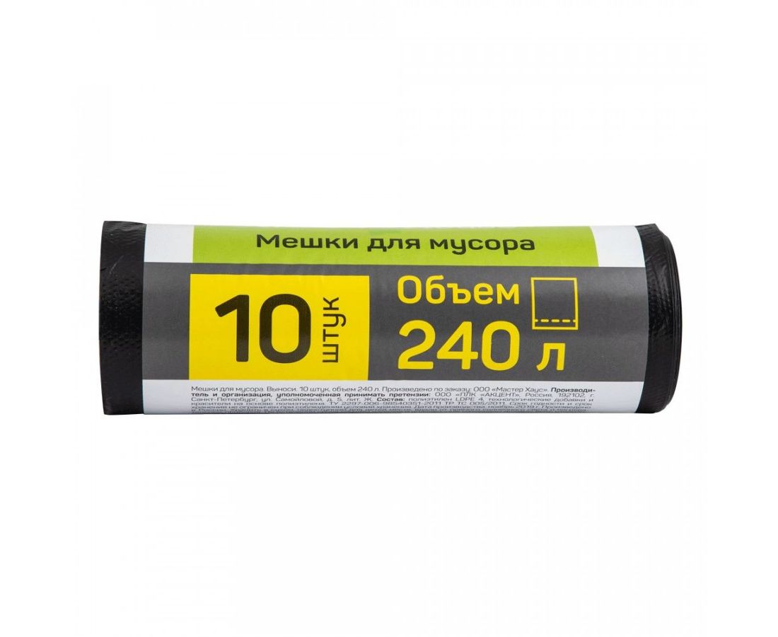 Пакеты для мусора MasterHouse 240 л 10 шт. универсальны и удобны для сбора отходов разного типа. Устойчивы к ударам, повреждениям, не растягиваются. Удобны, когда необходимо провести уборку помещения после ремонтных работ. Большой объем позволяет сразу очистить много пространства.