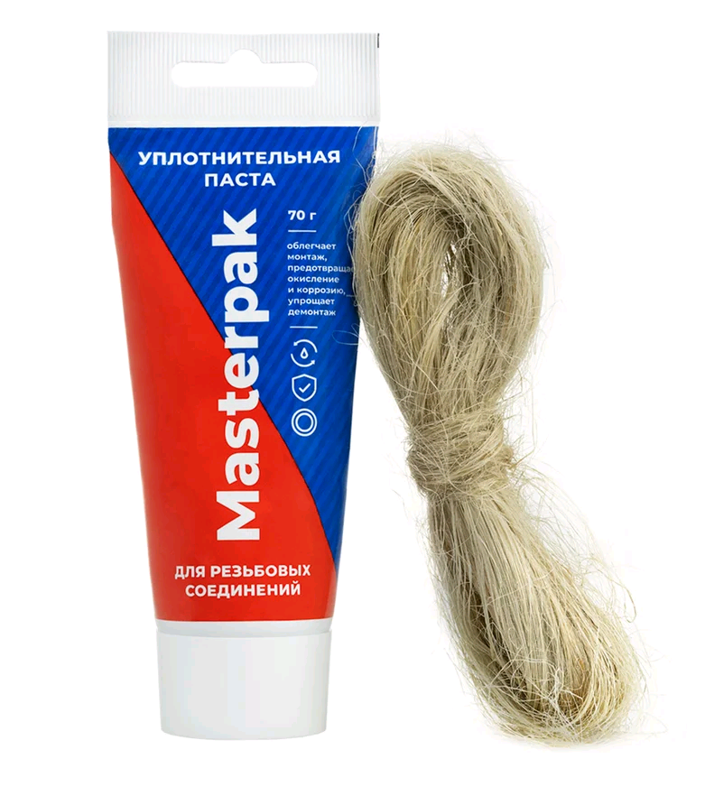 Комплект паста уплотнительная Masterpak вода/пар туба и лен MasterProf применяется для уплотнения резьбовых соединений в системах водоснабжения, отопления и сжатого воздуха. Использование пасты совместно со льном упрощает сборку соединений и их последующую разборку, предотвращает разрыв льняных волокон при сборке, чрезмерное набухание, пересыхание или гниение льна, повышает герметичность соединений.