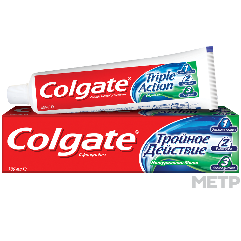 Паста зубная Colgate Тройное действие 100 мл с приятным вкусом и ароматом мяты прекрасно справляется одновременно с тремя задачами. Она успешно противостоит кариесу, устраняет темный налет с поверхности эмали и придает дыханию свежесть. Подходит всей семье — и взрослым, и маленьким.