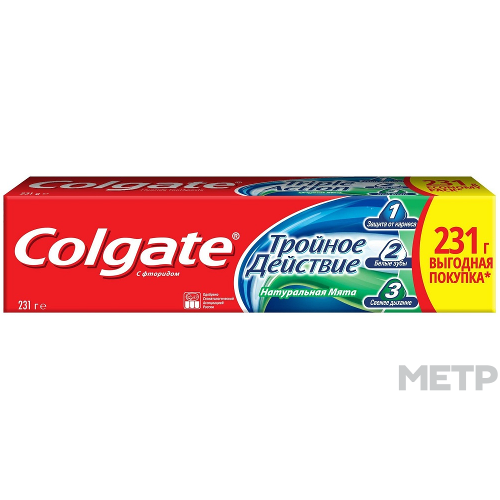 Паста зубная Colgate Тройное действие 150 мл — большой тюбик предназначен для пользования всей семьей. Его содержимое, обладающее ароматом и вкусом мяты, выполняет сразу 3 задачи — борется с очагами кариеса, осветляет потемневшие участки эмали и способствует свежести дыхания.