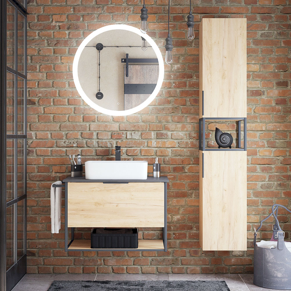 Коллекция ФРЕЙМ гармонично вписывается в любой современный интерьер ванной комнаты благодаря натуральным фактурам. Пенал оснащен двумя вместительными секциями с распашными створками. За каждой дверцей по две регулируемых по высоте полки. Все элементы коллекции представлены в навесном варианте, могут дополнительно комплектоваться опорами в черном цвете.