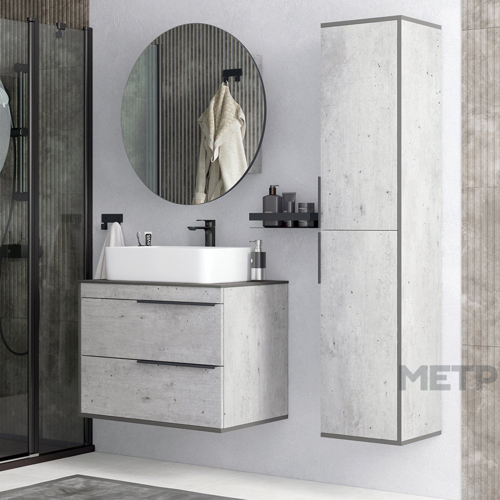Коллекция мебели для ванных комнат ГРЭММИ воспевает ассиметричный дизайн, универсальные оттенки и удобство в эксплуатации. Корпус мебели выполнен в цвете "Метрополитан Грэй". Металлические ручки на фасадах выполнены в черном цвете и гармонируют с черной кромкой по бокам и снизу фасадов. Все элементы коллекции представлены в навесном варианте, могут дополнительно комплектоваться опорами в черном цвете.